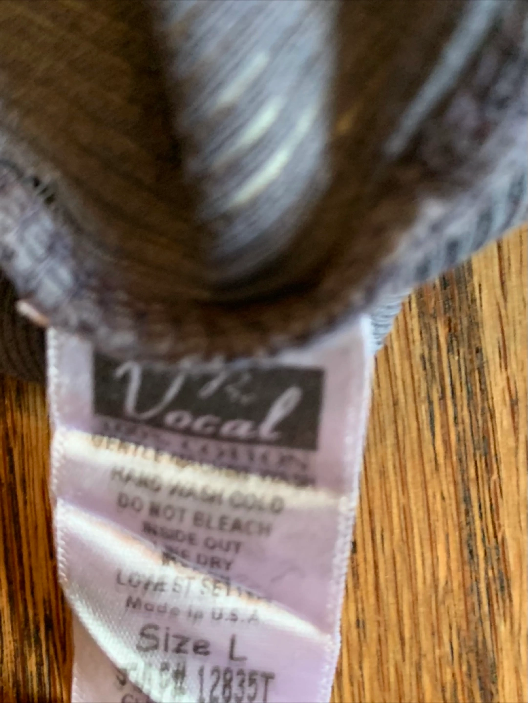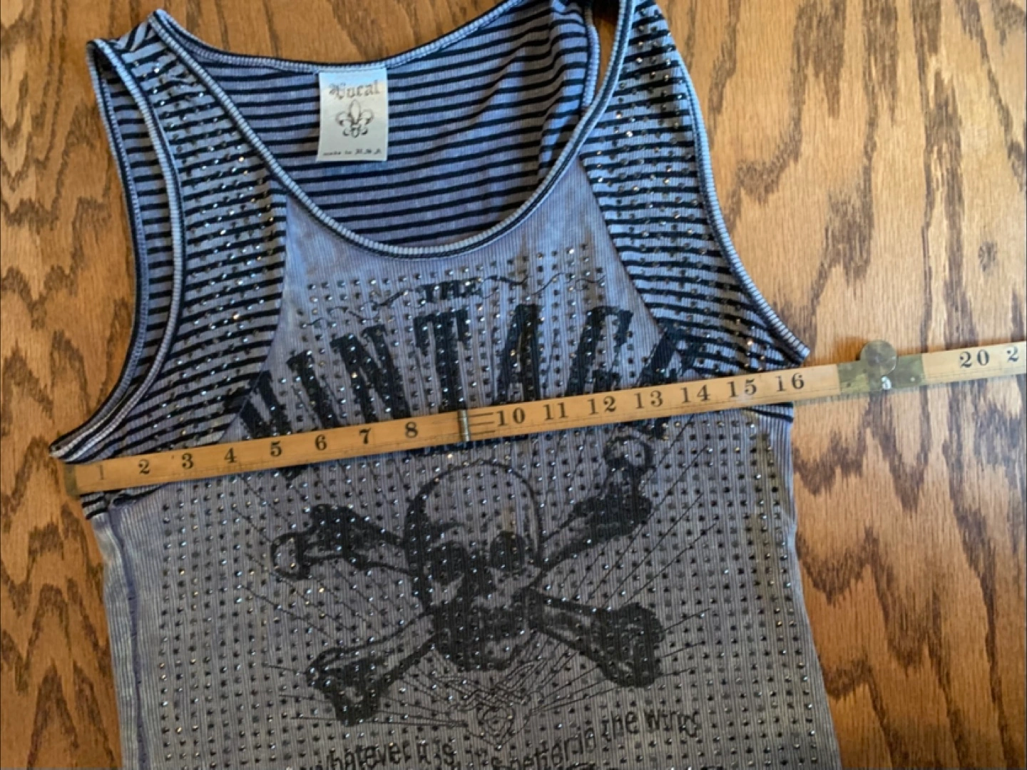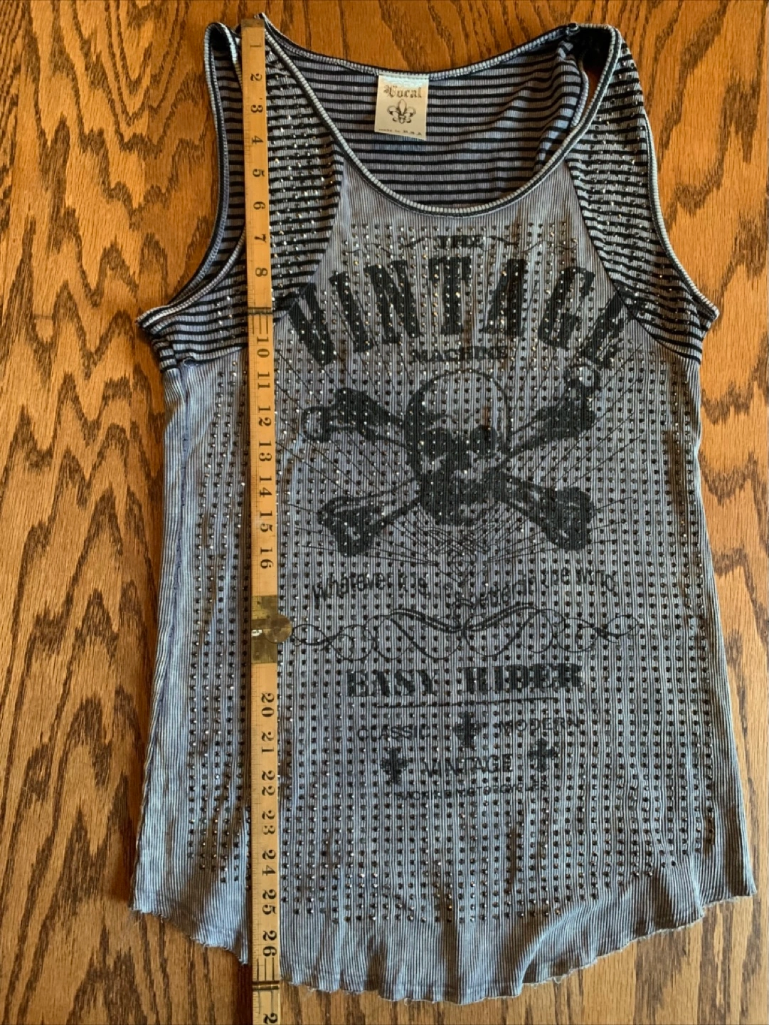 Vocal women's tank top. It's a gray and black striped tank with a skull and crossbones design. The size is a large and it measures about 17 inches across the chest.