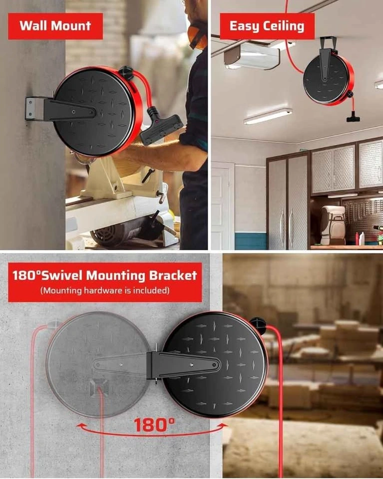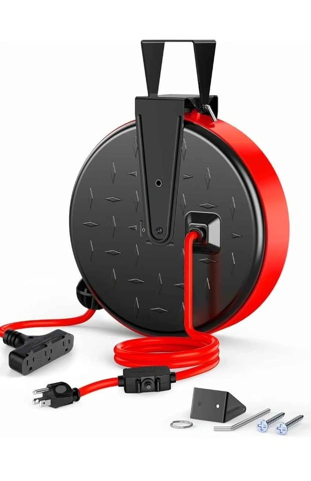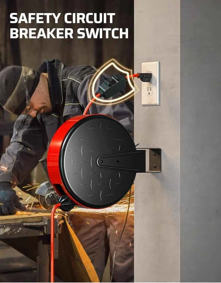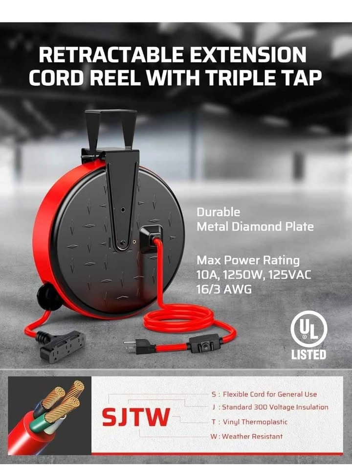 30FT Retractable Cord Reel with 3 Outlets. 16/3 Gauge SJTW Power Cord. Suitable for garage or workshop mounting. Features a 10A circuit breaker and metal plate. UL Listed. Red color.