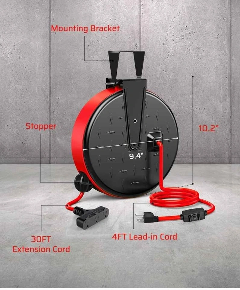 30FT Retractable Cord Reel with 3 Outlets. 16/3 Gauge SJTW Power Cord. Suitable for garage or workshop mounting. Features a 10A circuit breaker and metal plate. UL Listed. Red color.