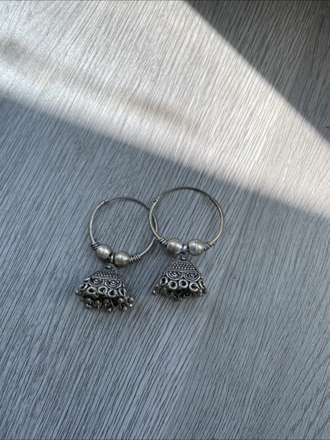 Selling a pair of silver jhumka hoop earrings! They have a detailed, traditional design and are in great condition. Perfect for adding a touch of elegance to any outfit!