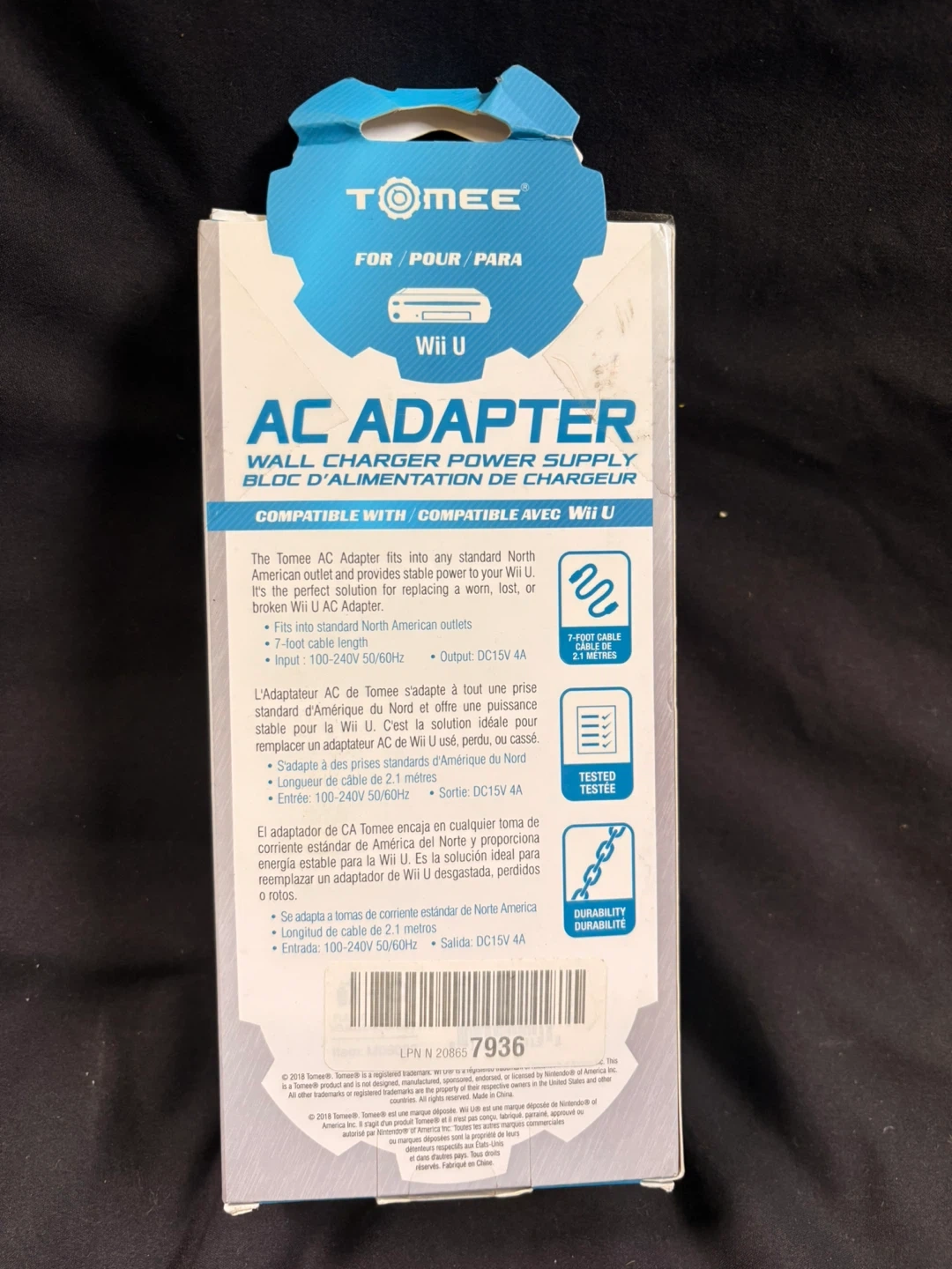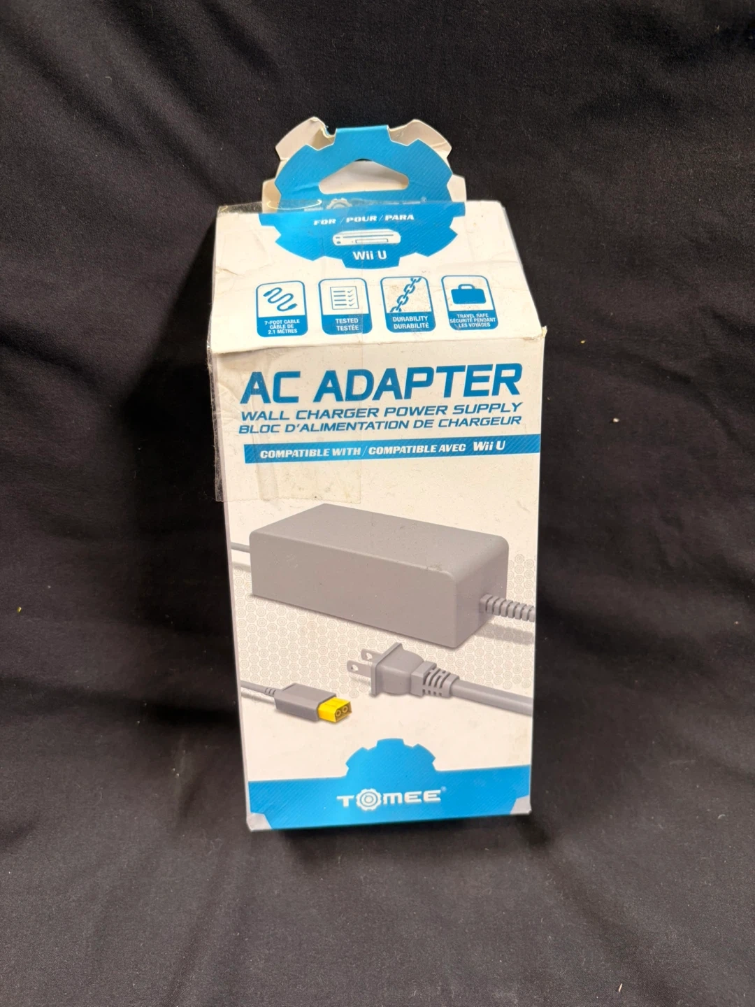 This Tomee AC adapter is a wall charger power supply designed for the Nintendo Wii U. It features a 7-foot cable and fits into standard North American outlets. The adapter is tested for durability.