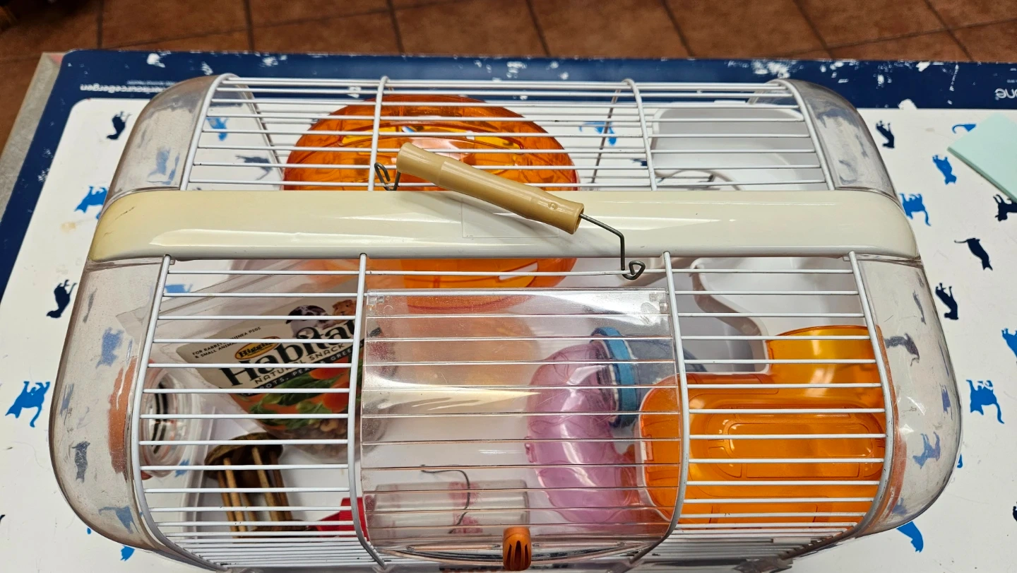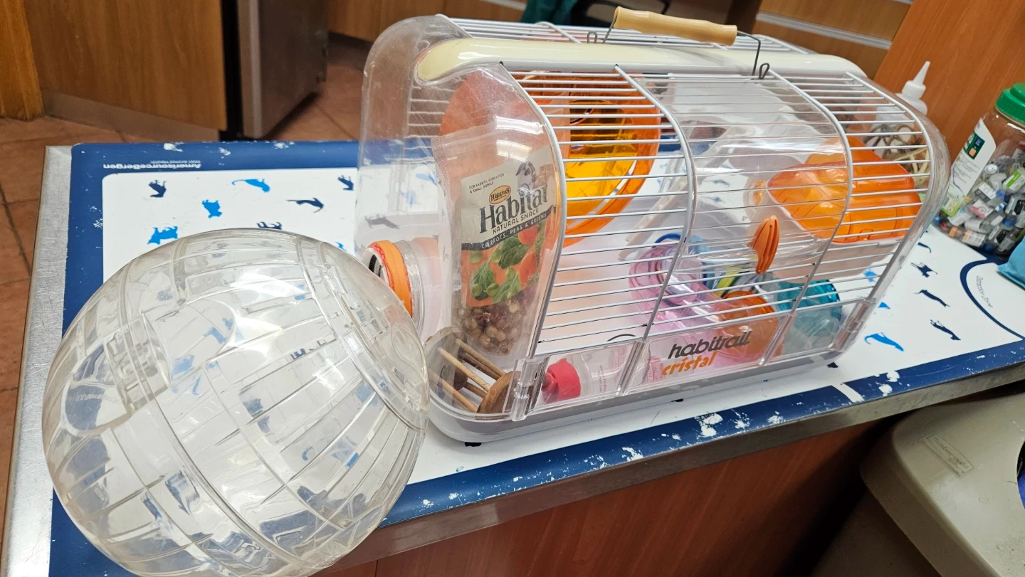 This is a Habitrail Cristal hamster cage. It's made of clear plastic with a wire top. Includes a water bottle, 1 tube tunnel and food dish. A hamster exercise wheel and ball is also included!