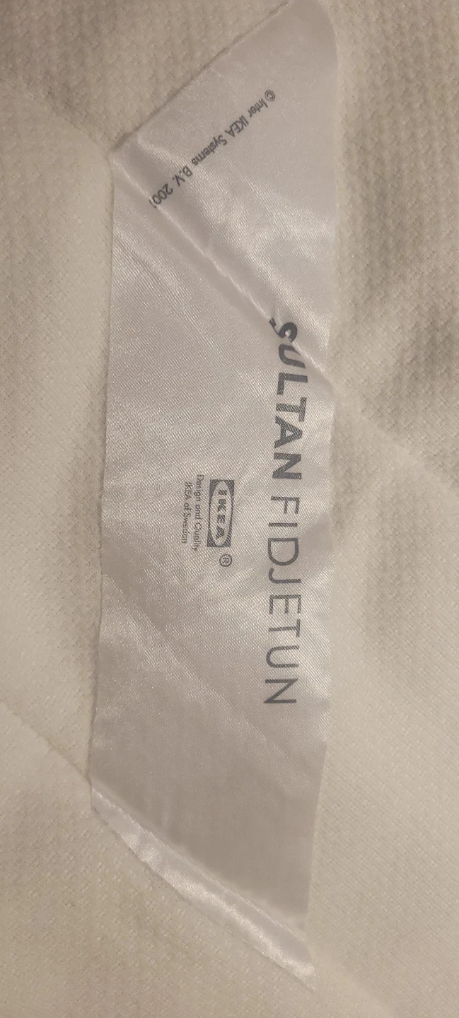 This is an IKEA SULTAN FIDJETUN twin mattress. It's made in Mexico. The mattress is yellow foam with a white cover. It measures 39 inches wide by 75 inches long.