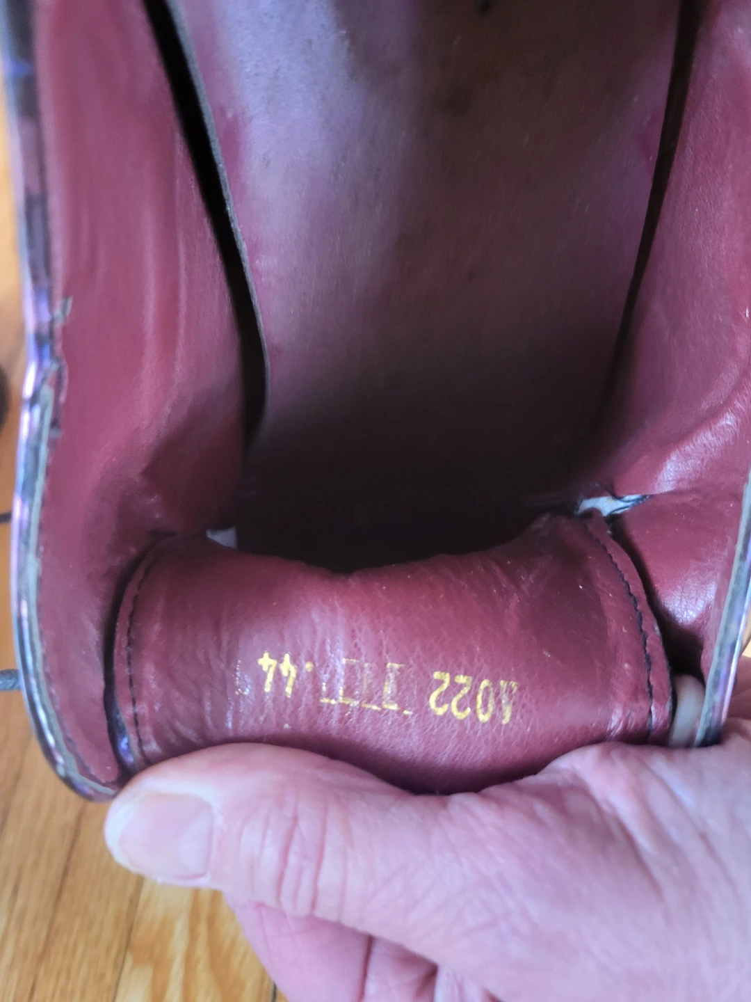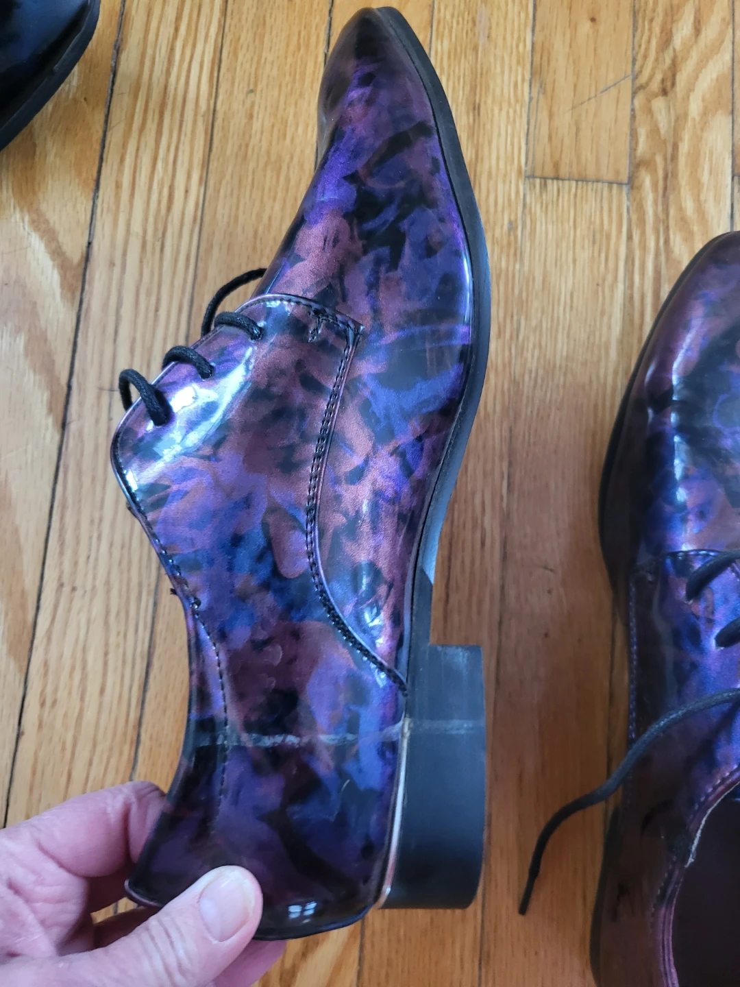 JUNHONG PRESTIGE men's dress shoes in a striking purple floral patent finish. These stylish shoes are a size 270. Size 10 Canadian. The interior lining is a rich burgundy colour.