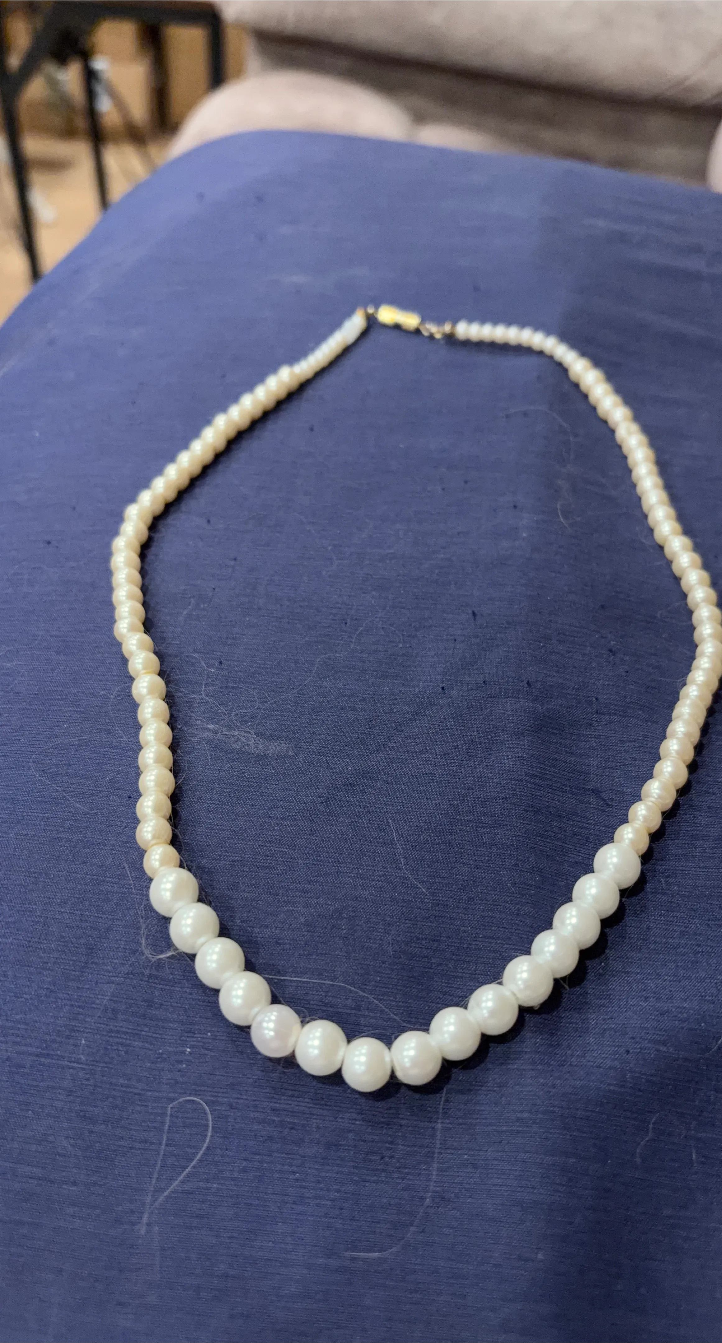 A classic strand of white faux pearls is strung together with a simple gold-toned clasp. The pearls graduate in size, with larger ones at the front. This necklace adds a touch of elegance to any outfit. It's a versatile accessory for both casual and formal occasions.