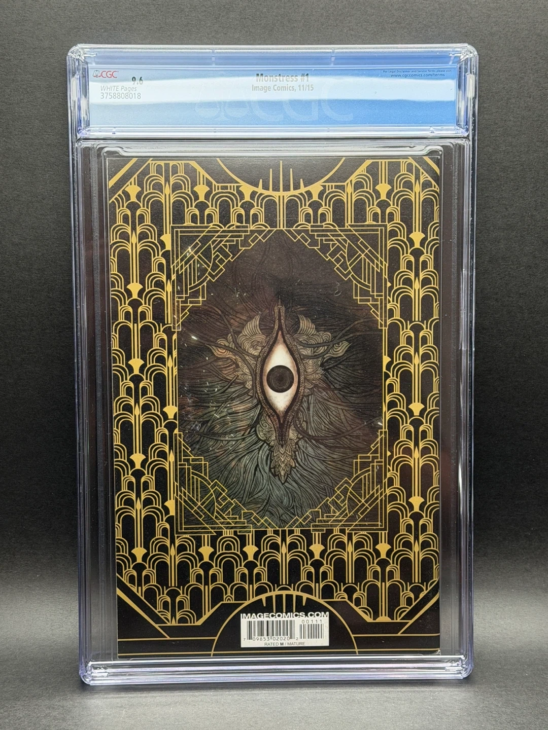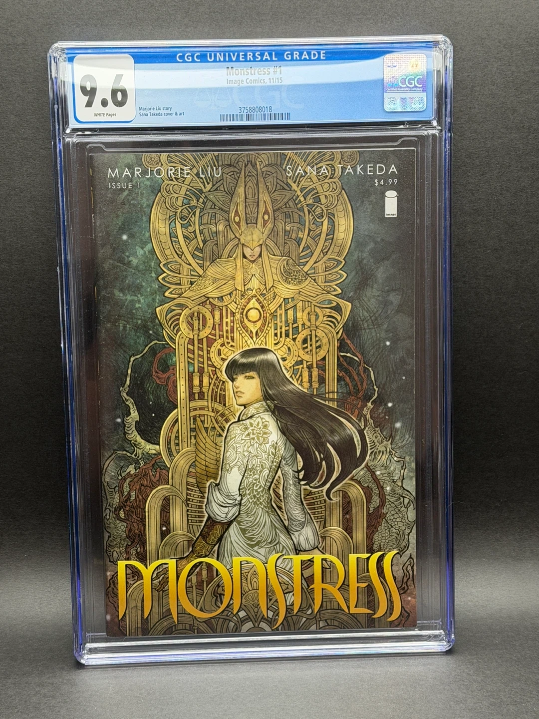 Monstress #1 comic book from Image Comics. Features story by Marjorie Liu and art by Sana Takeda. Comes in a graded CGC 9.6 White Pages case.