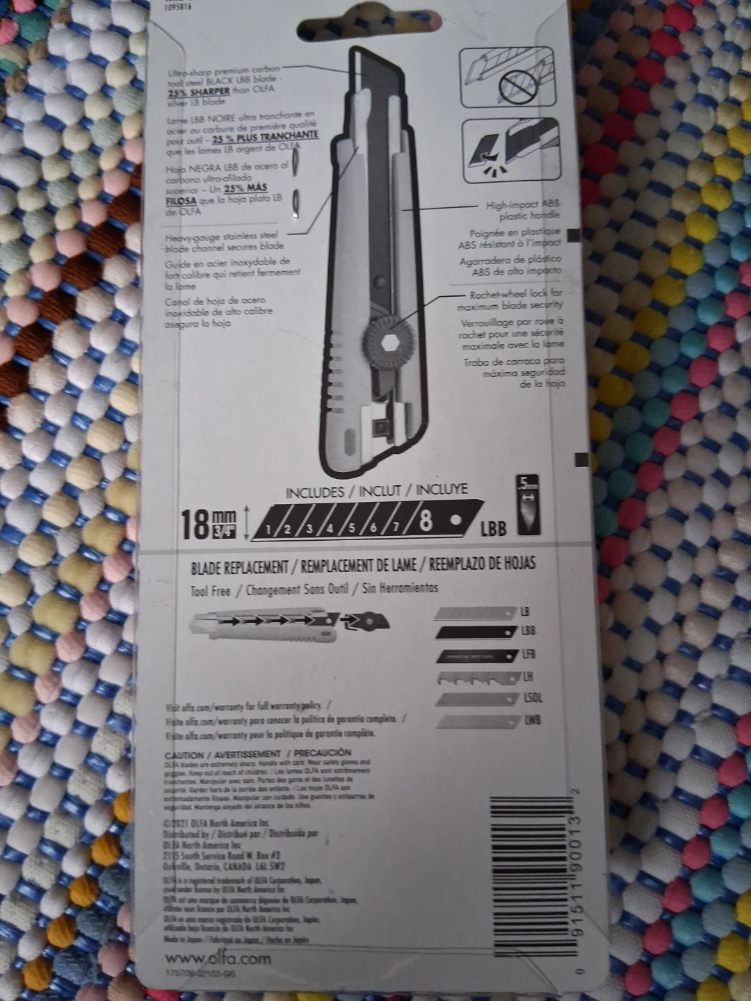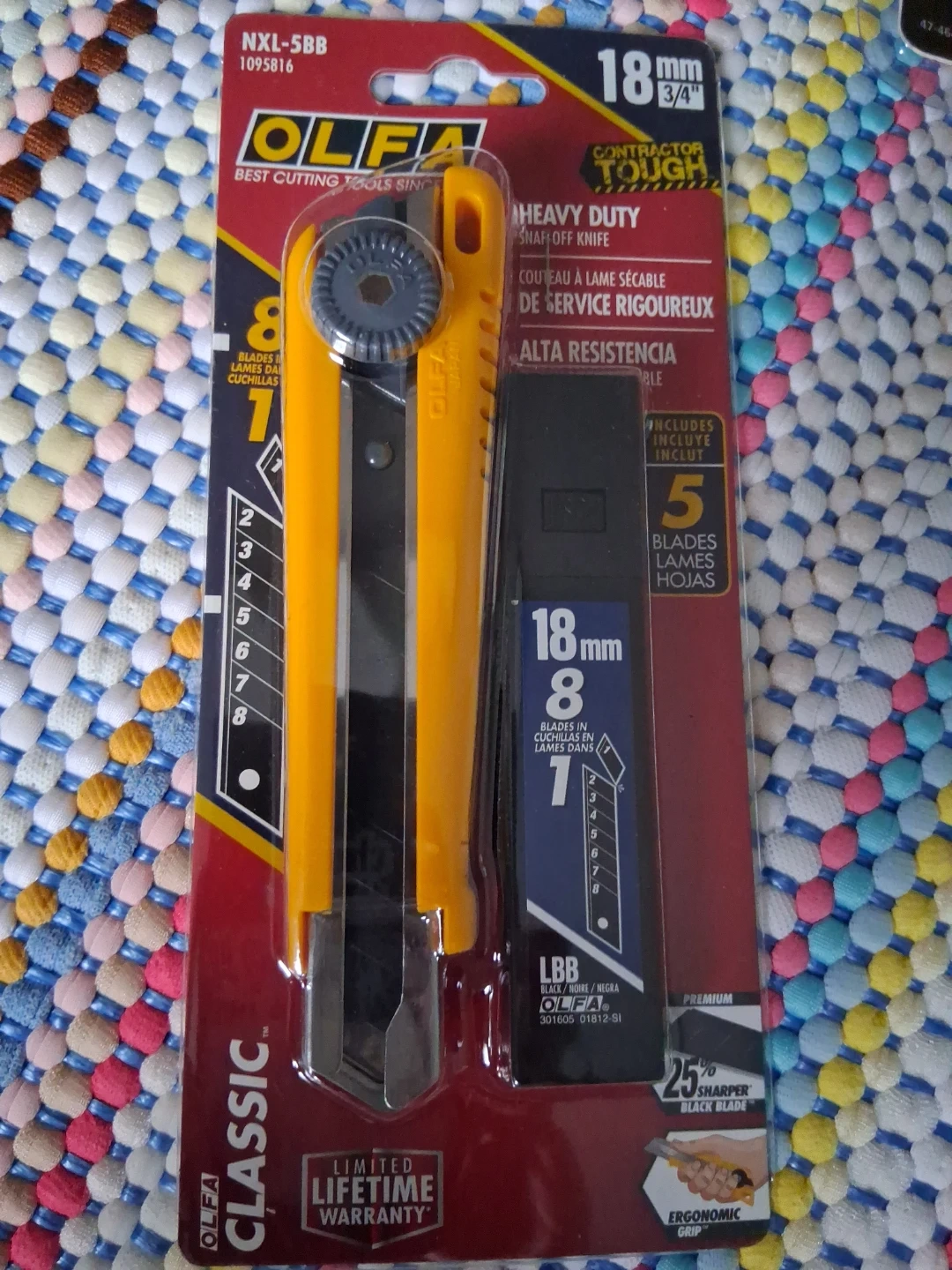 BOXING DAY Olfa NXL-5BB Heavy Duty Snap-Off Knife. It includes 8 blades. The blade is 18mm or 3/4". It's a contractor tough, heavy duty snap-off knife with a limited lifetime warranty. It's 25% sharper than OLFA blades. The knife has an ergonomic grip and a high-impact ABS plastic handle