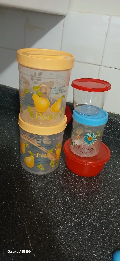 Clear plastic containers with colourful lids. Pear and floral designs. Includes a small wooden spoon. Various sizes.