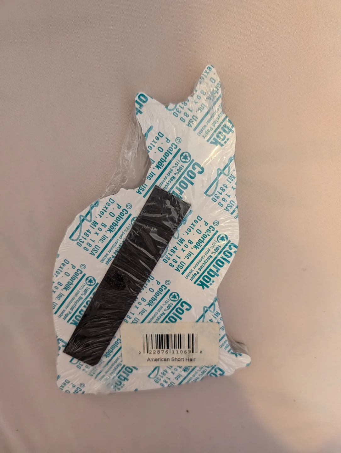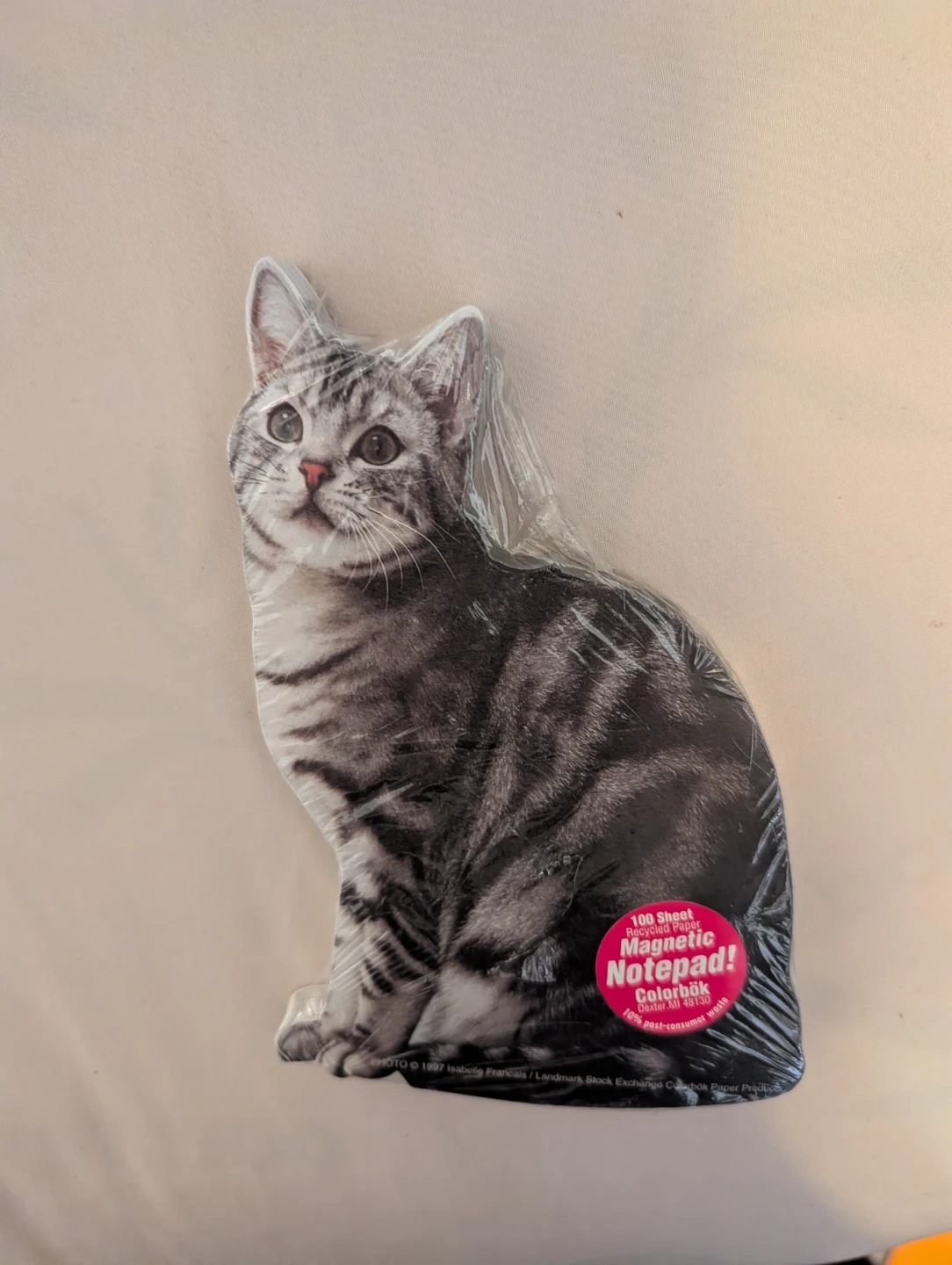 This is a Colorbok magnetic notepad shaped like a sitting cat. It has 100 sheets. The back has a magnetic strip to stick it to surfaces.