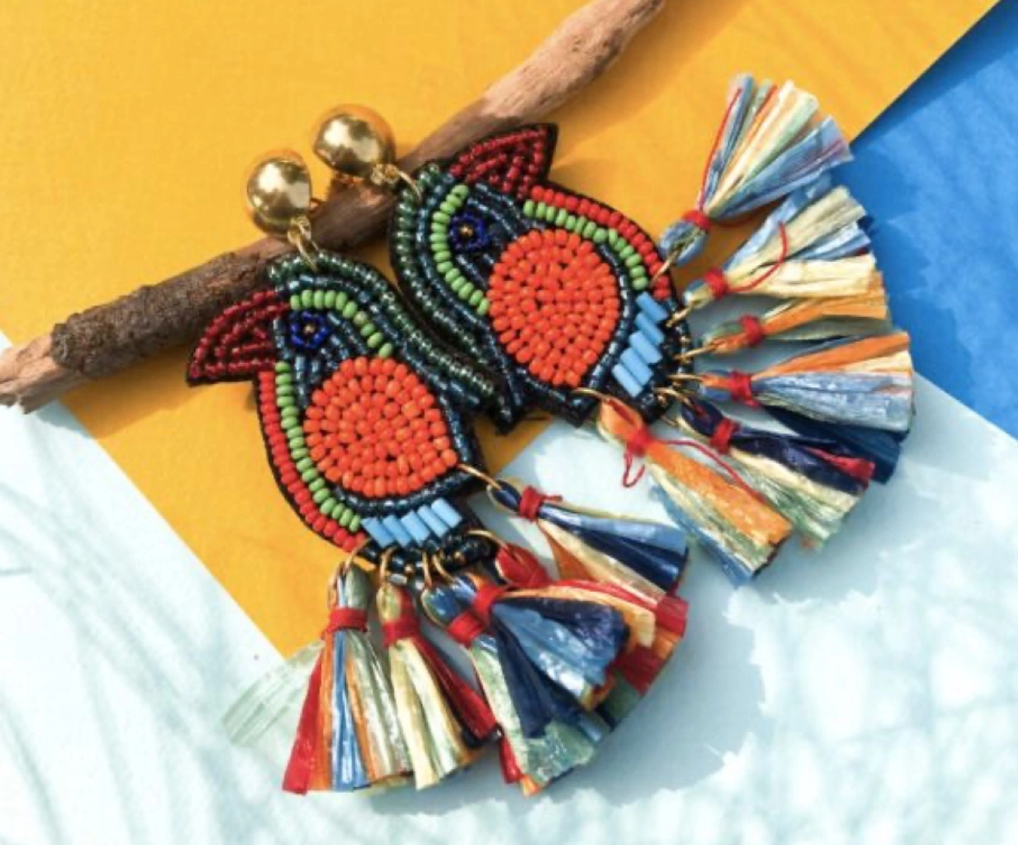 Statement earrings. Beaded bird design. Multicoloured tassels added for that extra flair.