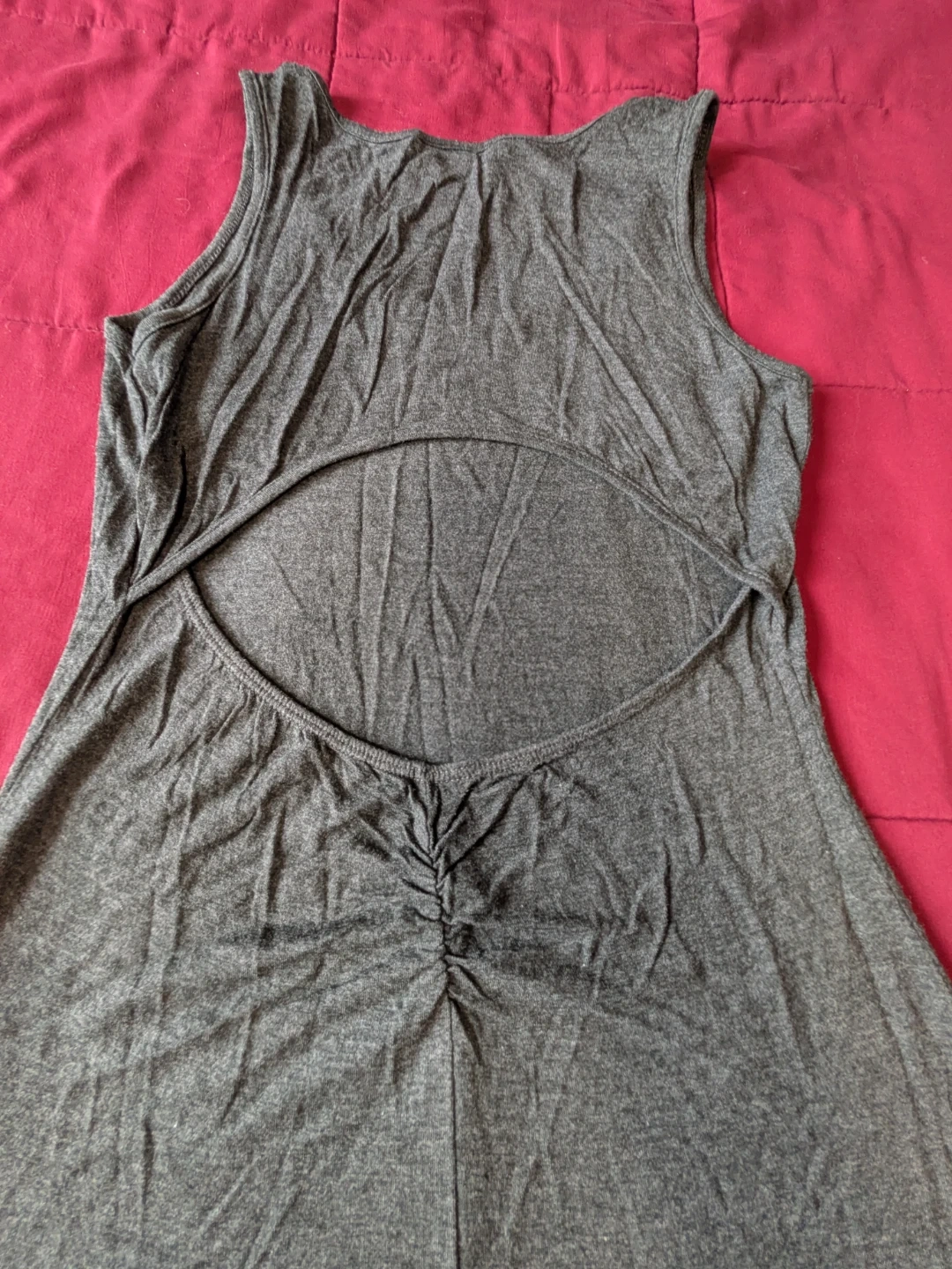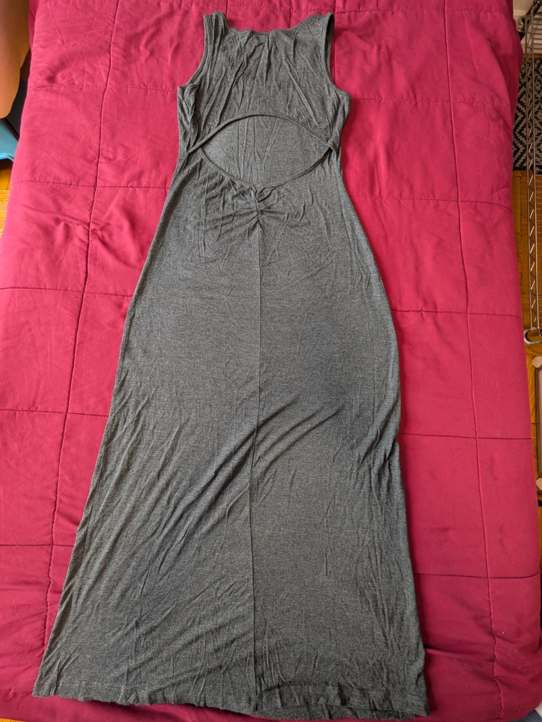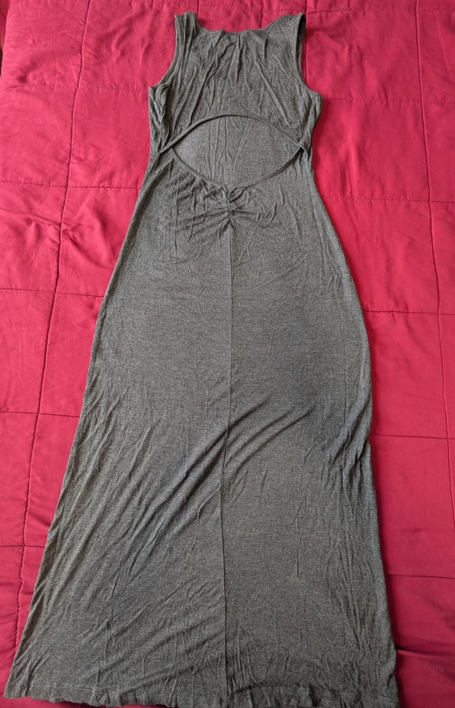 Comfy grey sleeveless maxi dress with a stylish open back cutout. It's made from a soft, stretchy material. This dress is perfect for warmer days!