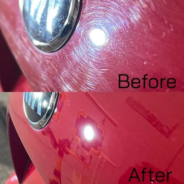 Before and after photos showing the impressive results of professional car detailing. This service effectively removes scratches and swirl marks, restoring a high-gloss finish to your vehicle's paintwork. Get that showroom shine back!