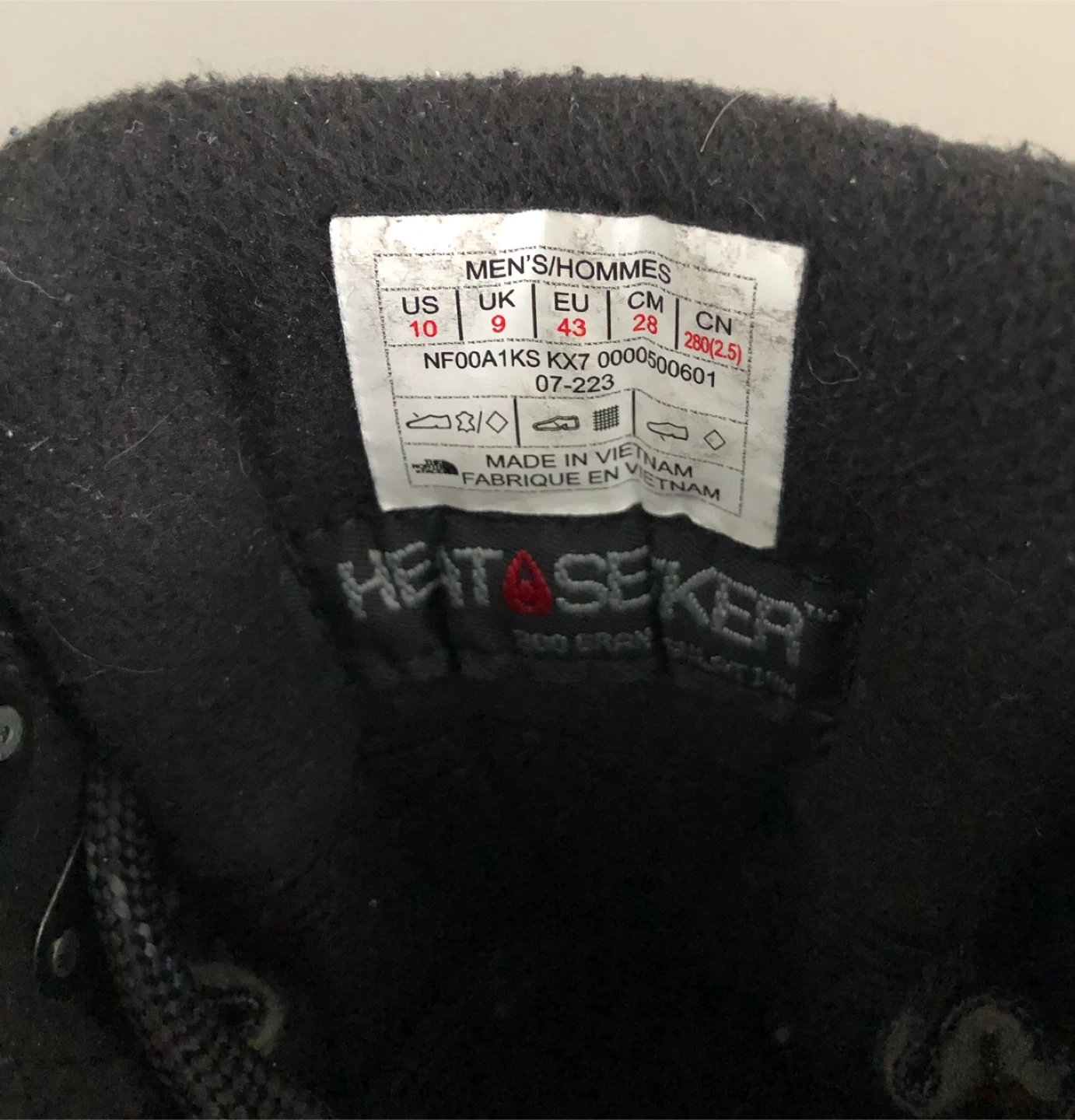 These are The North Face men's waterproof winter boots. They feature Heatseeker insulation for warmth. The outsoles are designed for traction. Suitable for cold weather activities. Absolutely new. Real size would be US9. East Kildonan, no delivery. 50$, cash. Free bugs, free smoke, pet friendly house.