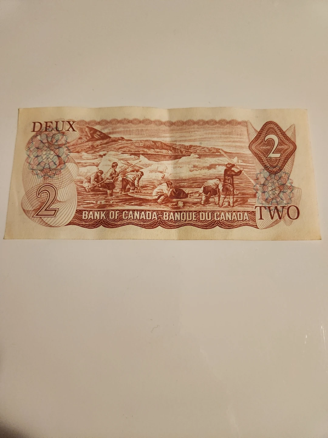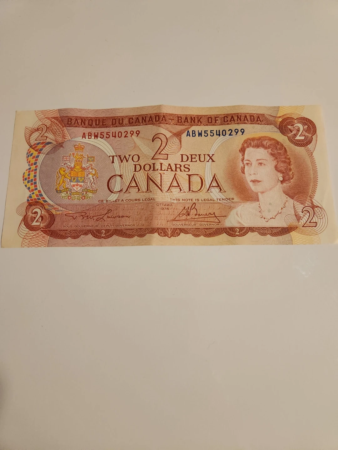 This is a 1974 two dollar bill from the Bank of Canada. It features Queen Elizabeth II on the front and a depiction of a Hudson's Bay Company store on the back. This note is legal tender.
