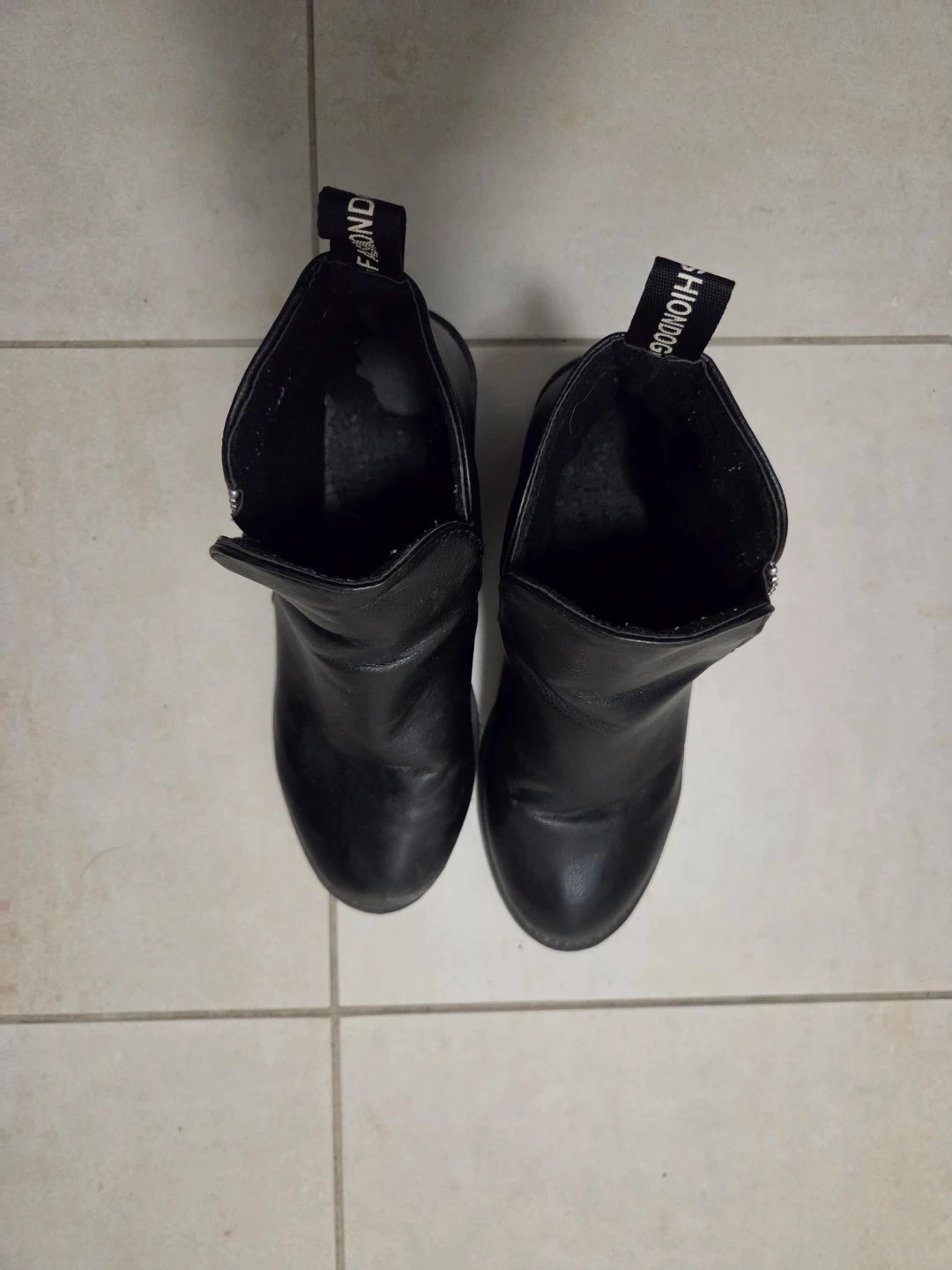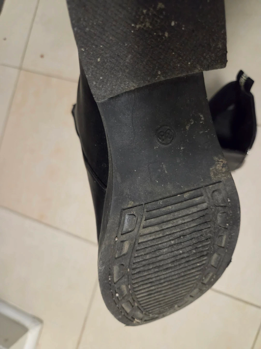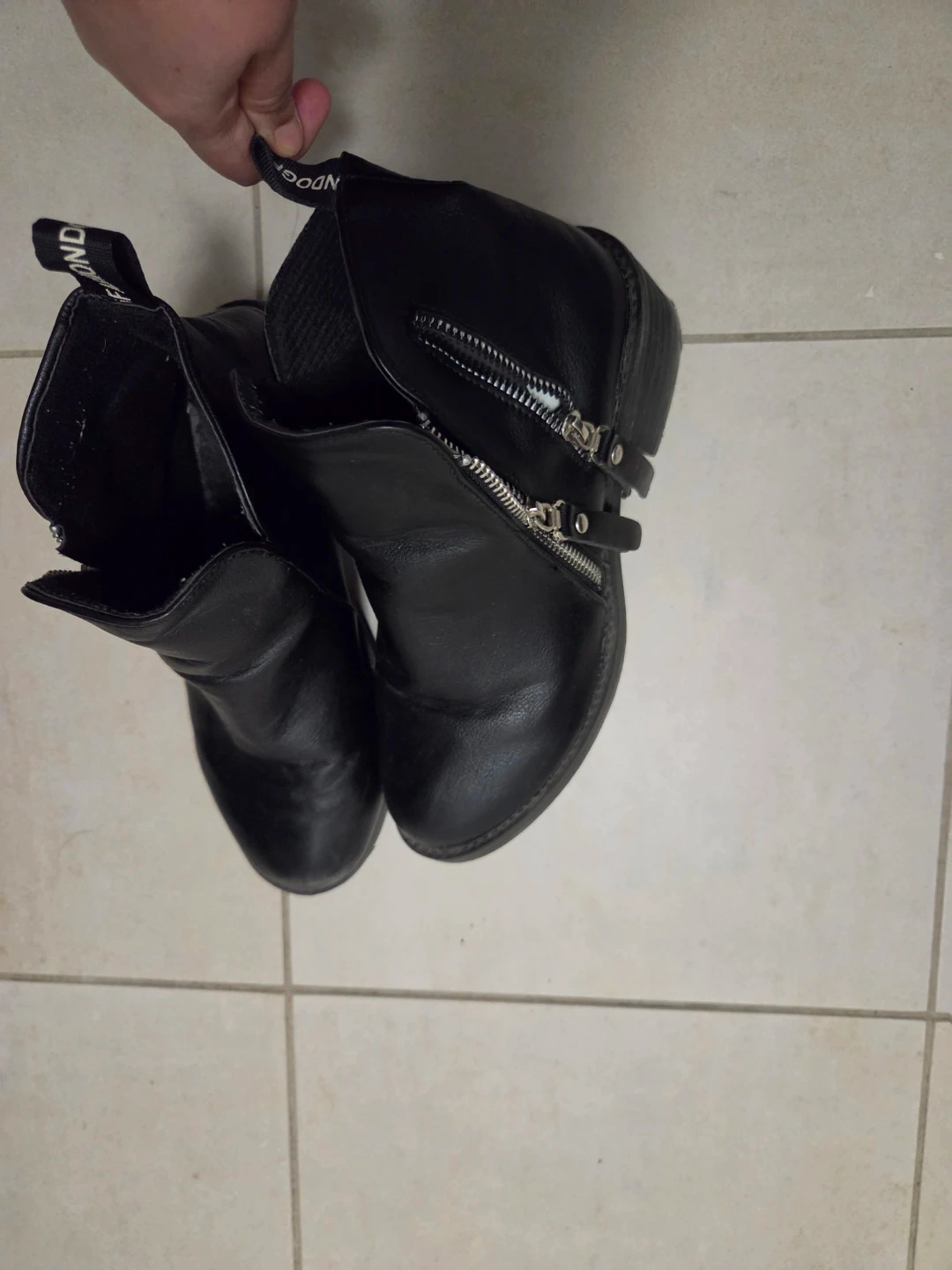 These black ankle boots are made from faux leather and feature side zippers for easy on and off. The sole has a textured grip. A decorative buckle strap is also present.