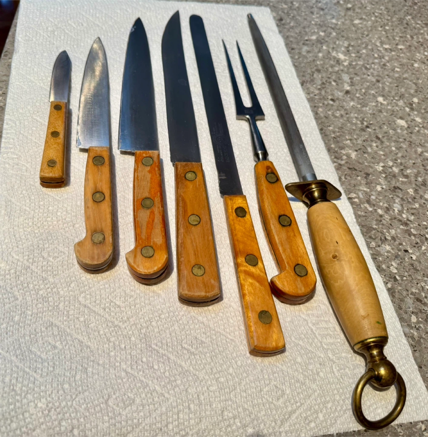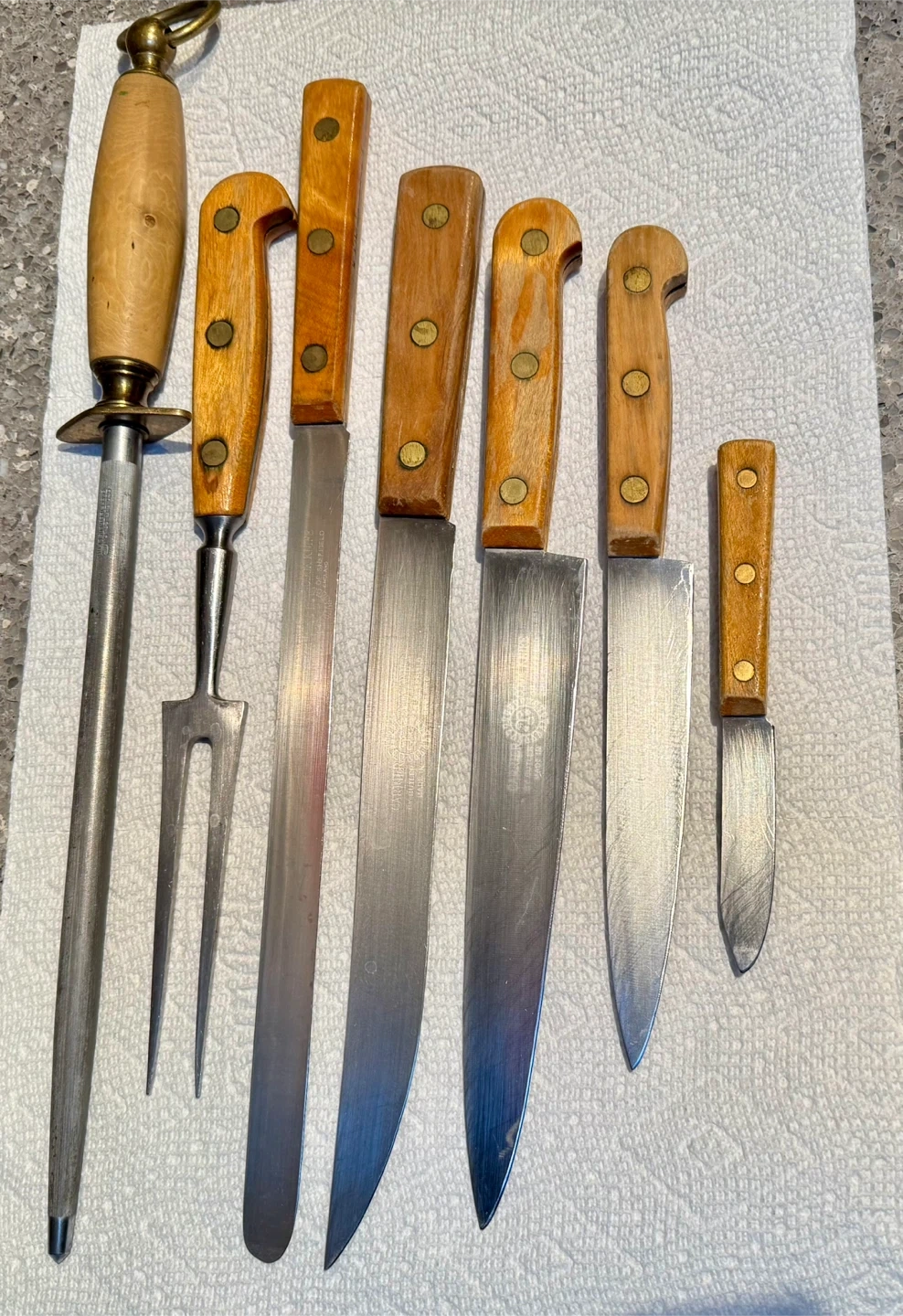 Selling a vintage set of Carrier Cook knives by Butler of Sheffield, made in England. The set includes various knives and a fork, all with wooden handles. Blades are superior Sheffield steel. Wooden handles. Purchased new in London in the 1970s.