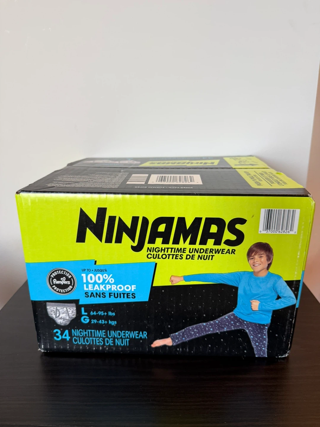This is a box of Pampers Ninjamas nighttime underwear. It offers up to 100% leakproof protection. The size is L, suitable for 64-95+ lbs or 29-43+ kgs. There are 34 pairs included in this box.
