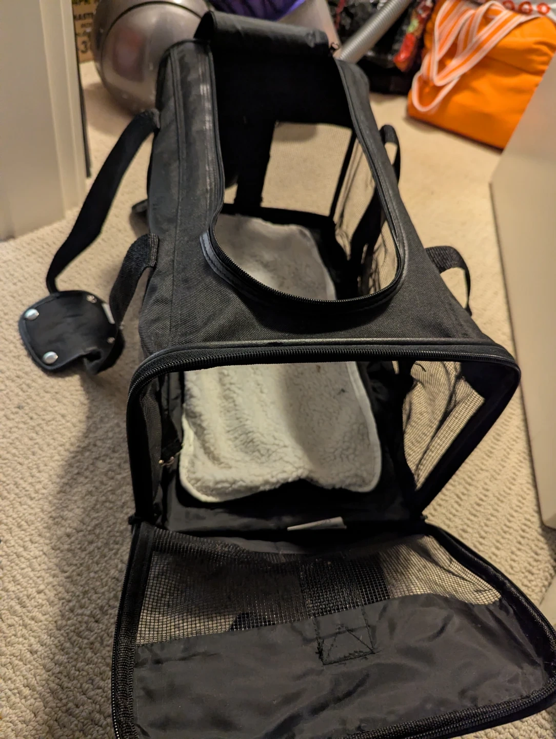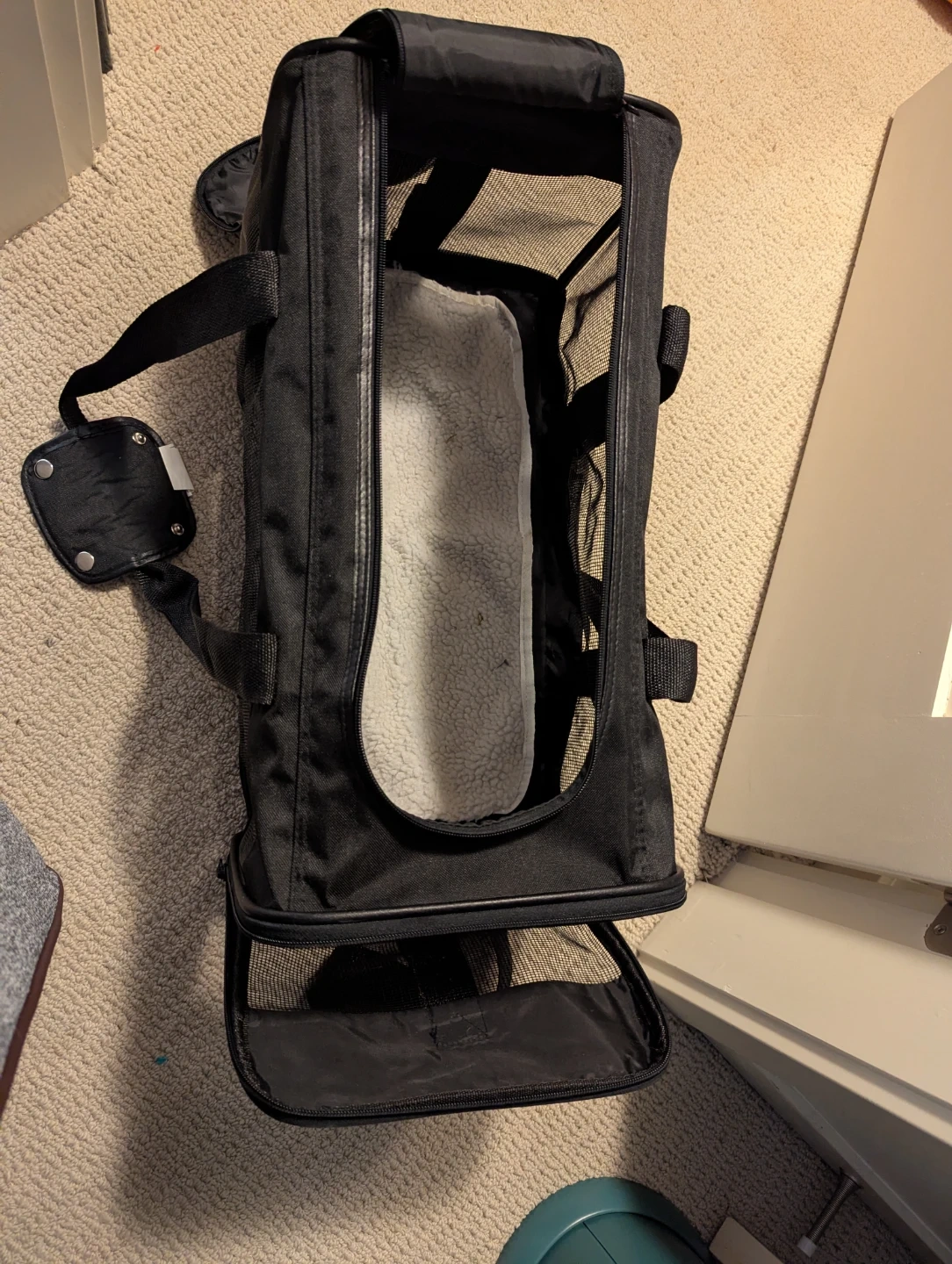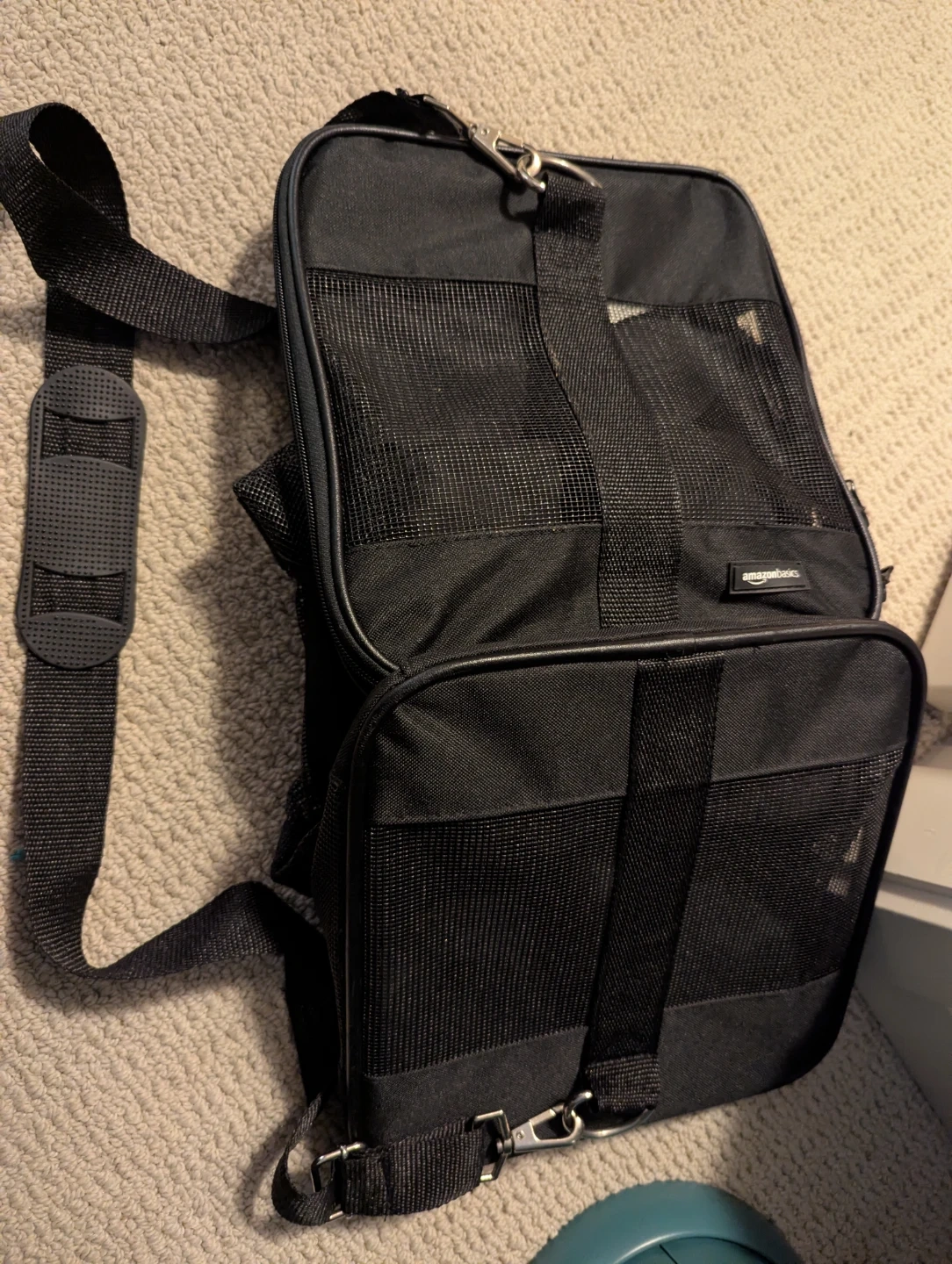 This is a black Amazon Basics pet carrier bag. It's made of durable fabric with mesh panels for ventilation. Includes a soft, removable liner inside. Zippers allow for easy access from the top and front.