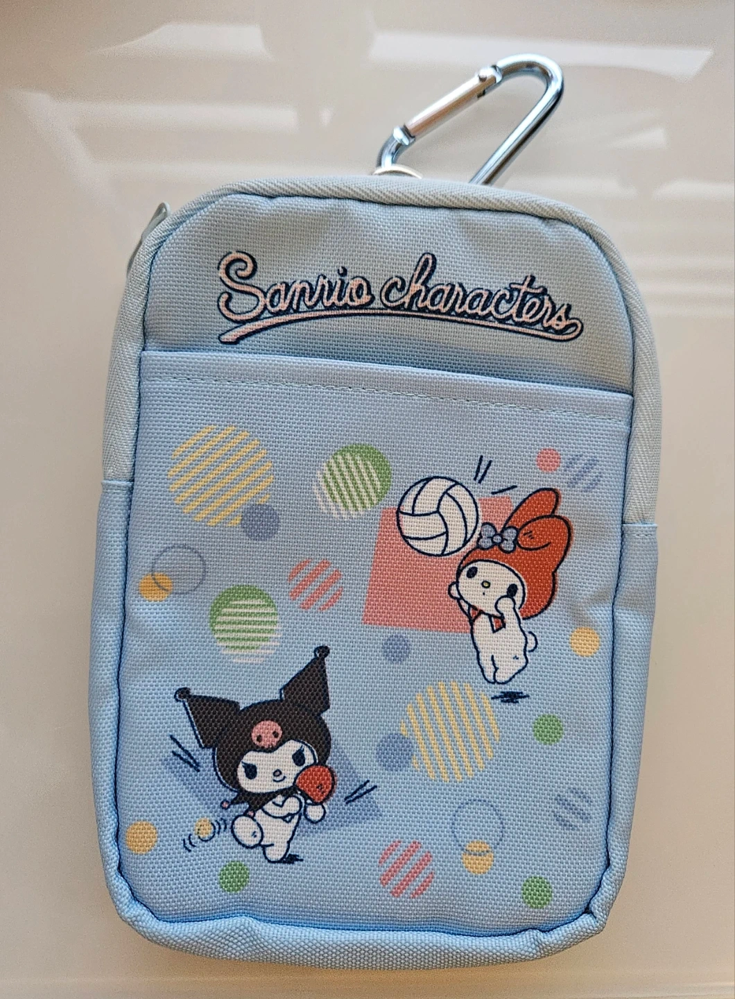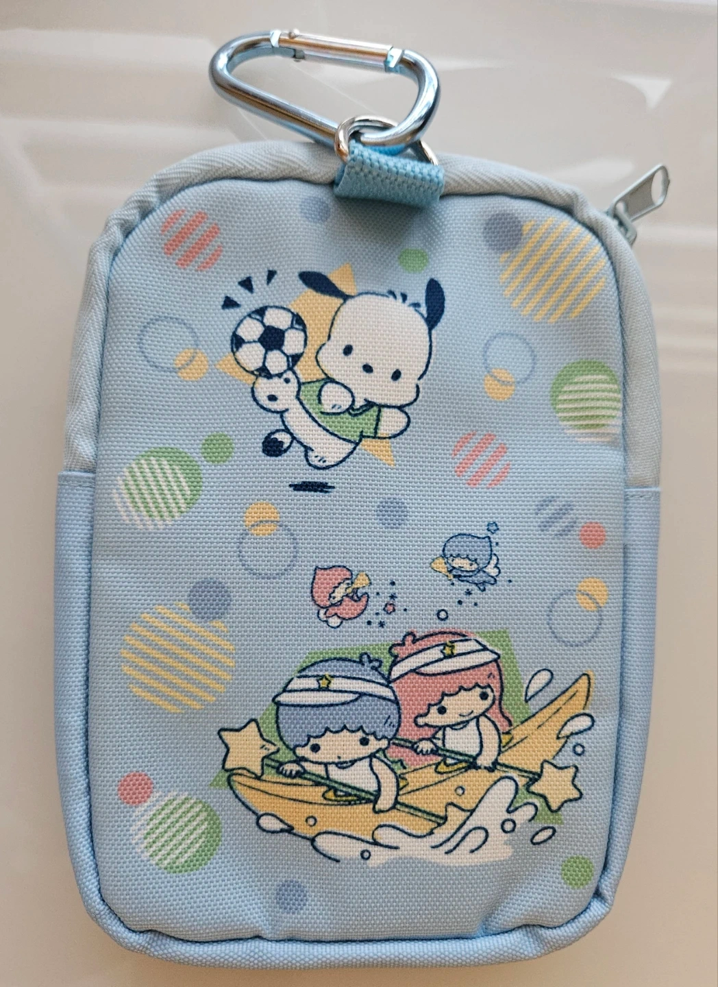 Light blue pouch featuring various Sanrio characters like Kuromi, My Melody, Pochacco, and Little Twins Star. It has a zipper closure and a carabiner clip for easy attachment. Great for storing small items like phone, passports cards, . It's perfect for fans of Sanrio characters!