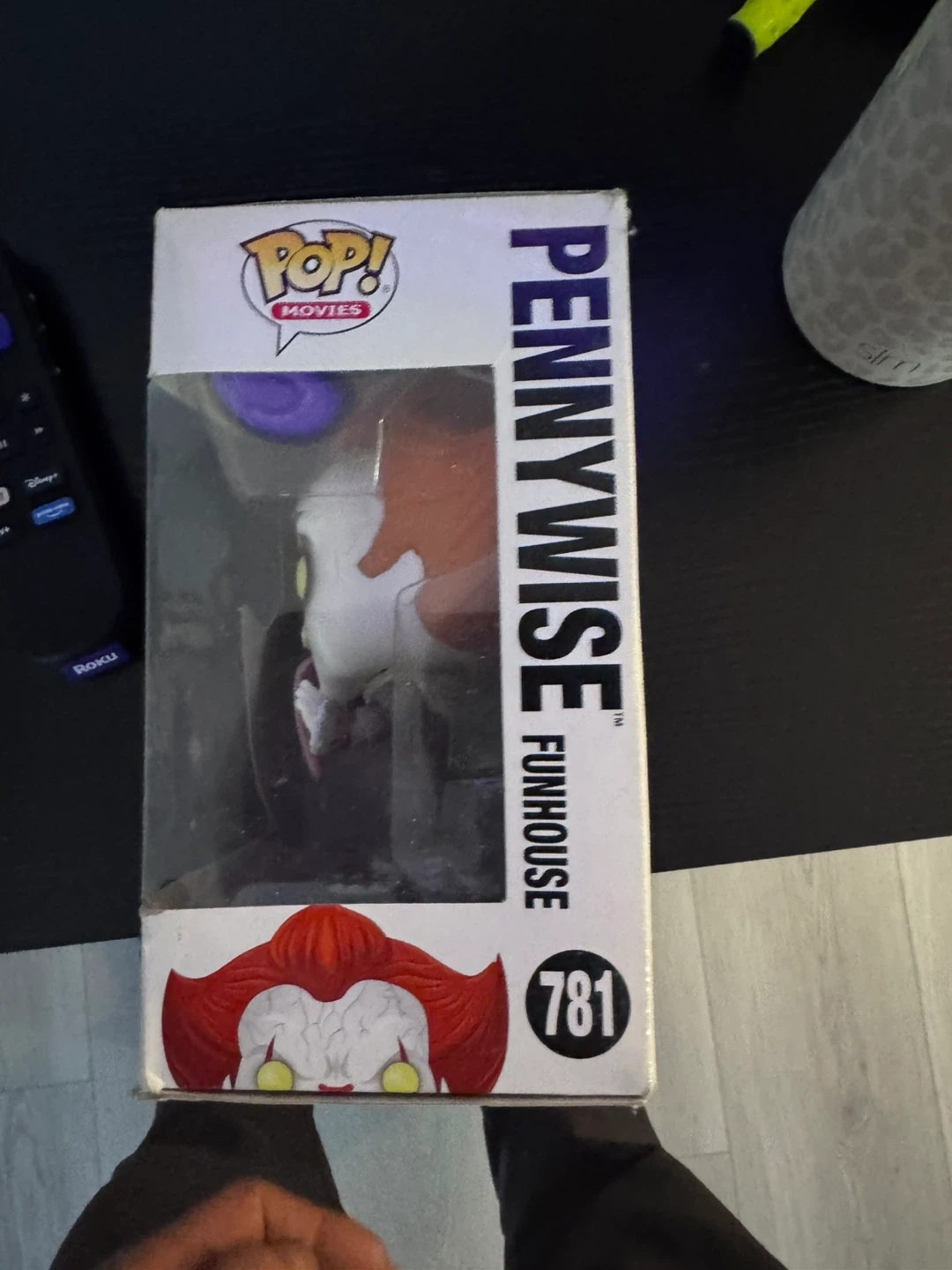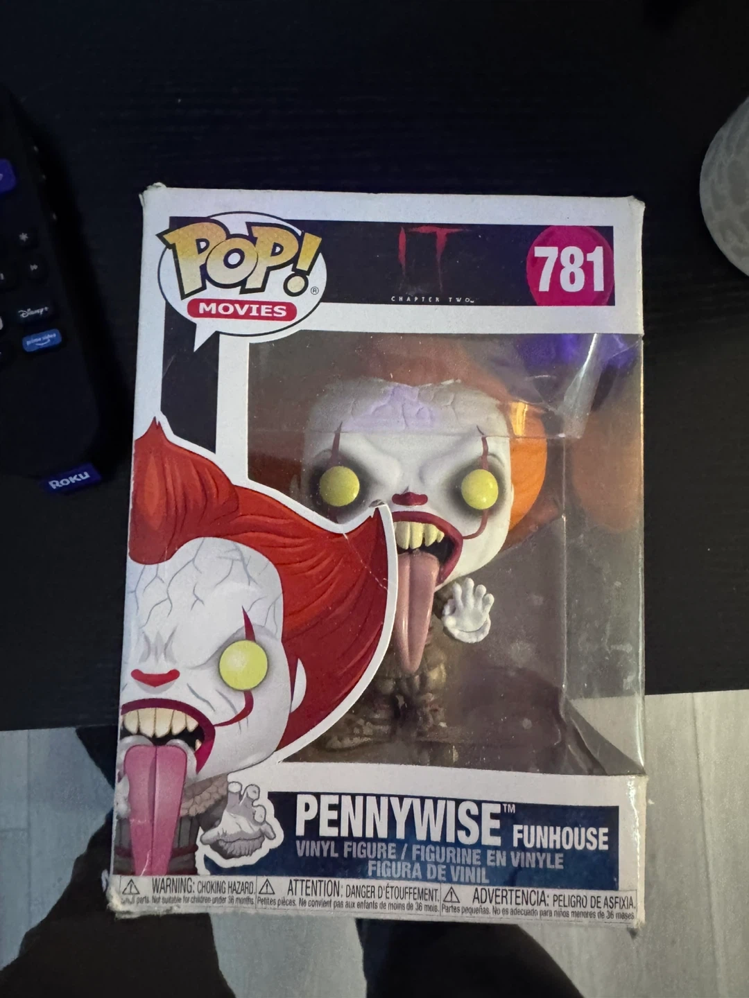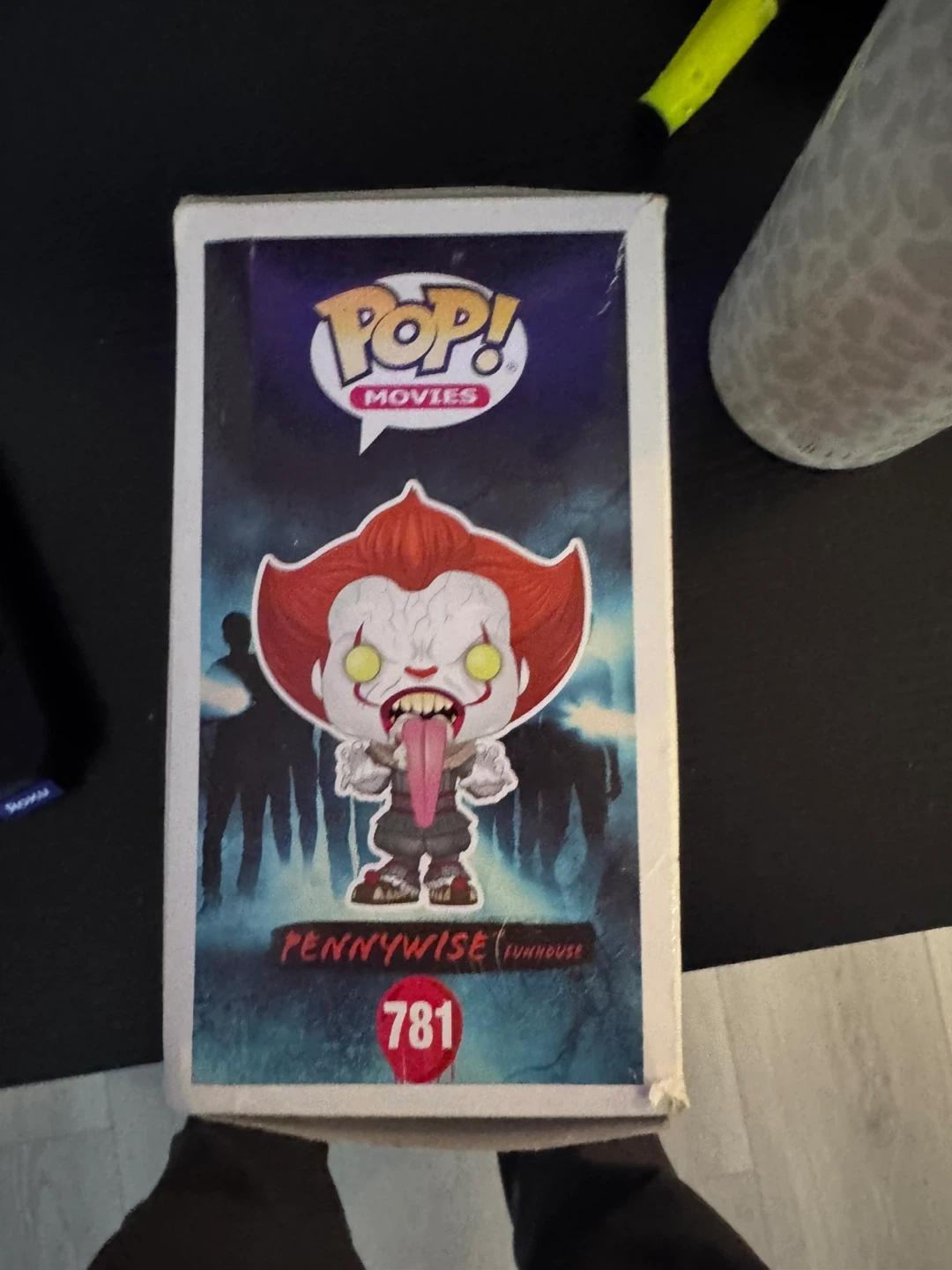 This is a Funko Pop! Movies vinyl figure of Pennywise from the Funhouse. It's model number 781 and comes in its original box. This collectible is great for horror fans!