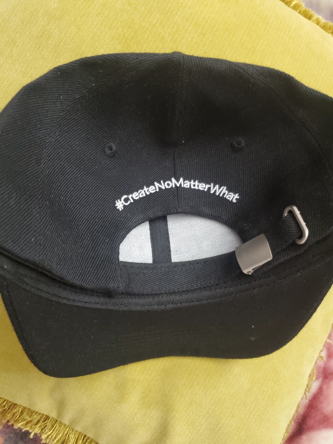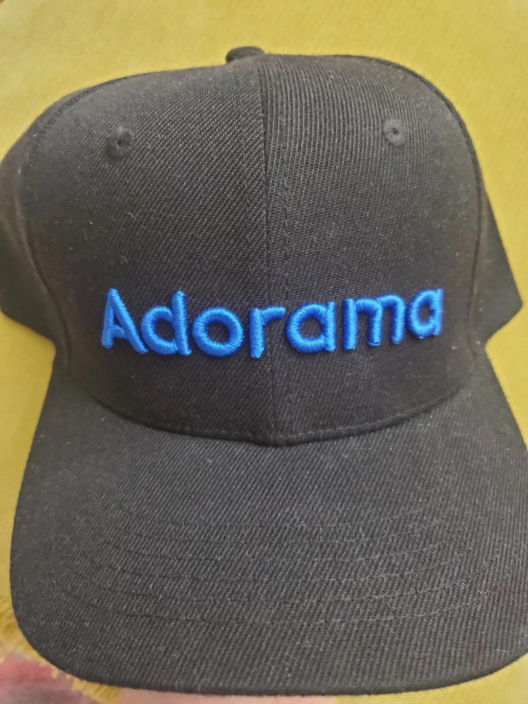 This is a black baseball cap with "Adorama" embroidered in blue on the front. The back features the hashtag "#CreateNoMatterWhat". It's adjustable with a metal clasp.