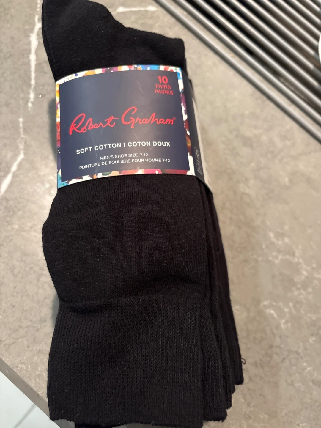9 NEW pairs of Robert Graham men's dress socks in black, made with 81% cotton, 17% nylon, and 2% spandex for a soft and comfortable fit. Shoe size 7-12, (*one pair missing from this pack)…**pick up on Chandos Drive in Chicopee area of South Kitchener N2A4H8