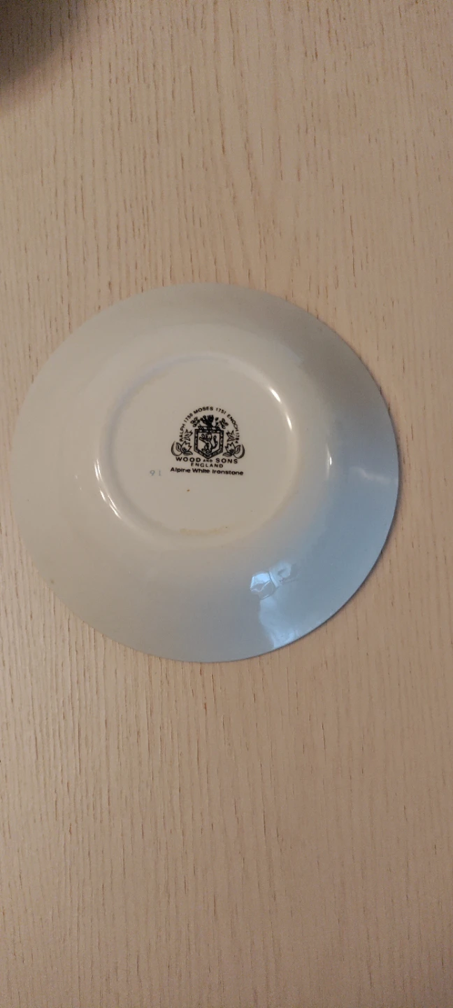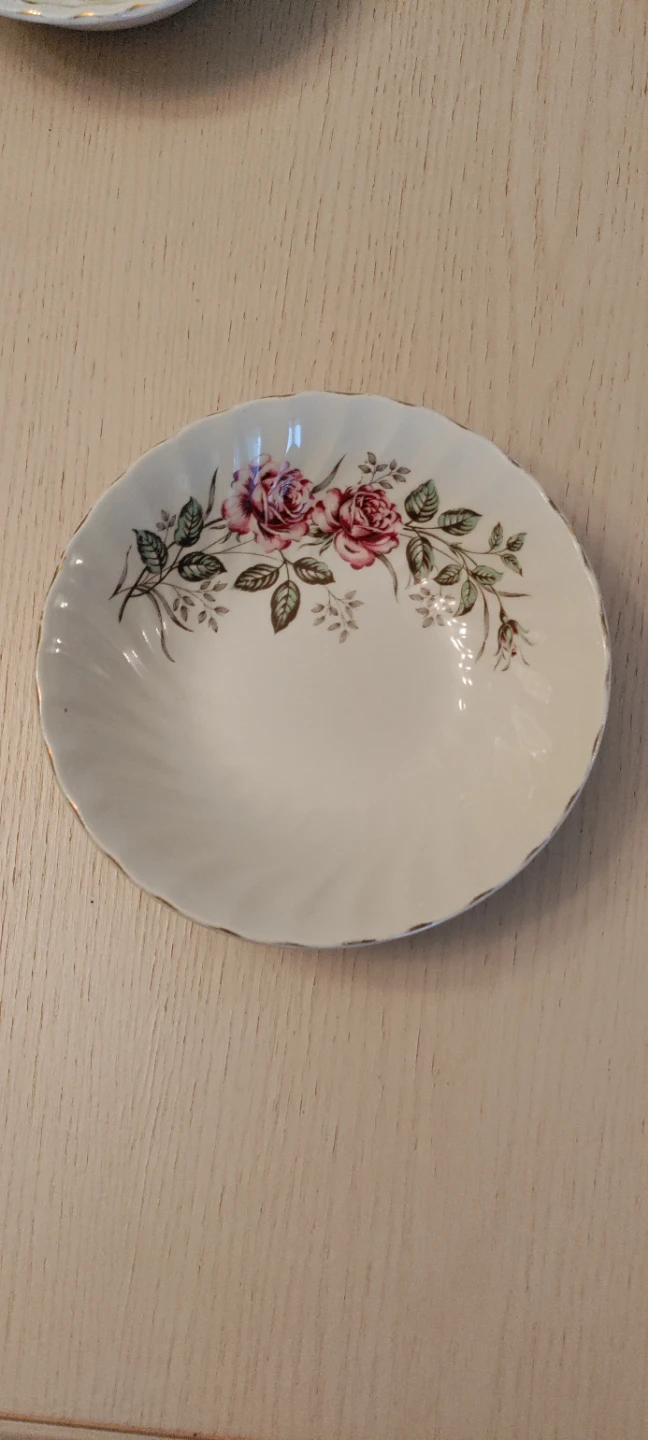 A Williamson-Moss saucer in the Ashara White pattern. Made of durable ironstone. This piece features a delicate rose design with a gold rim. It's perfect for serving tea or coffee.