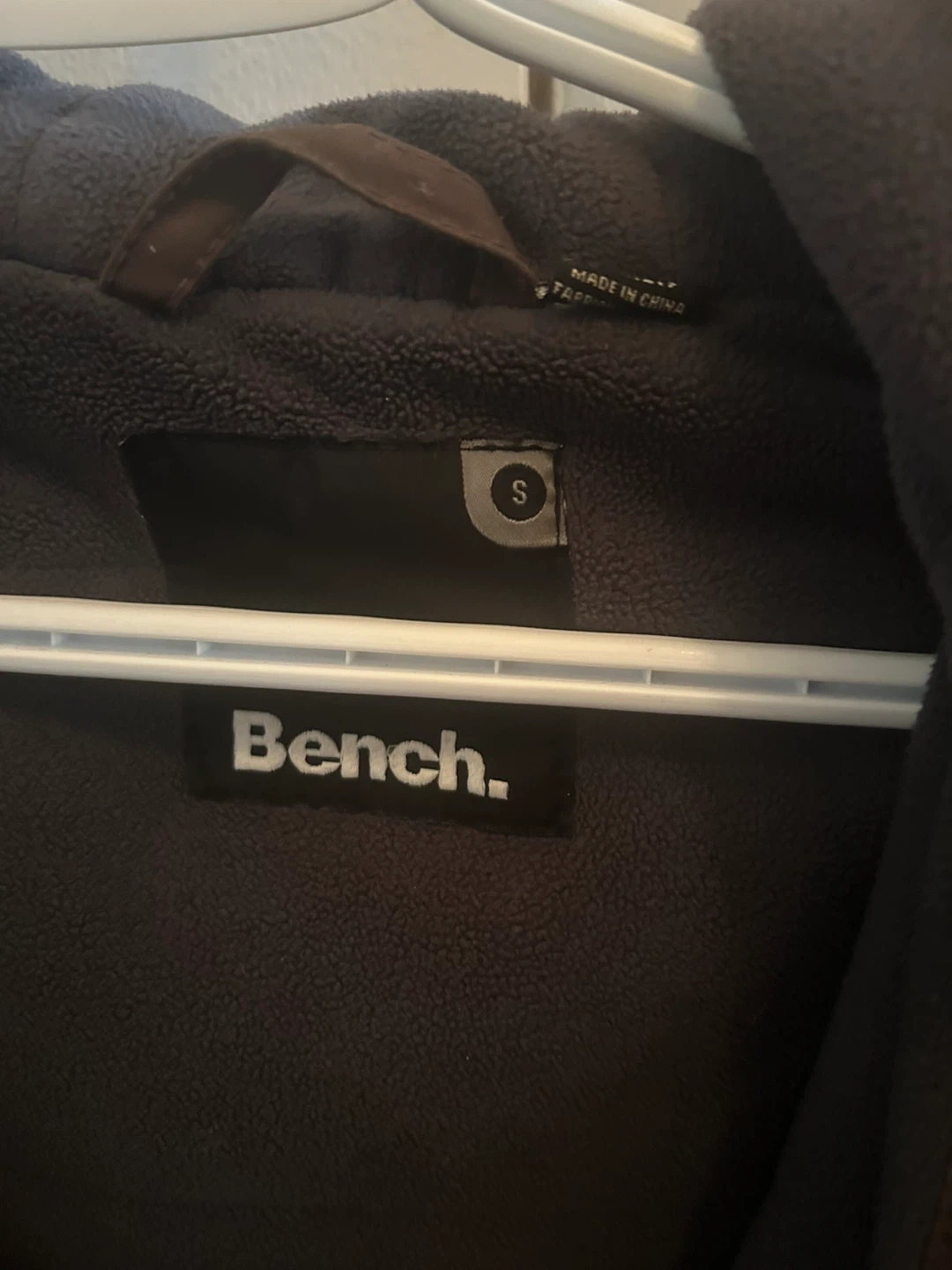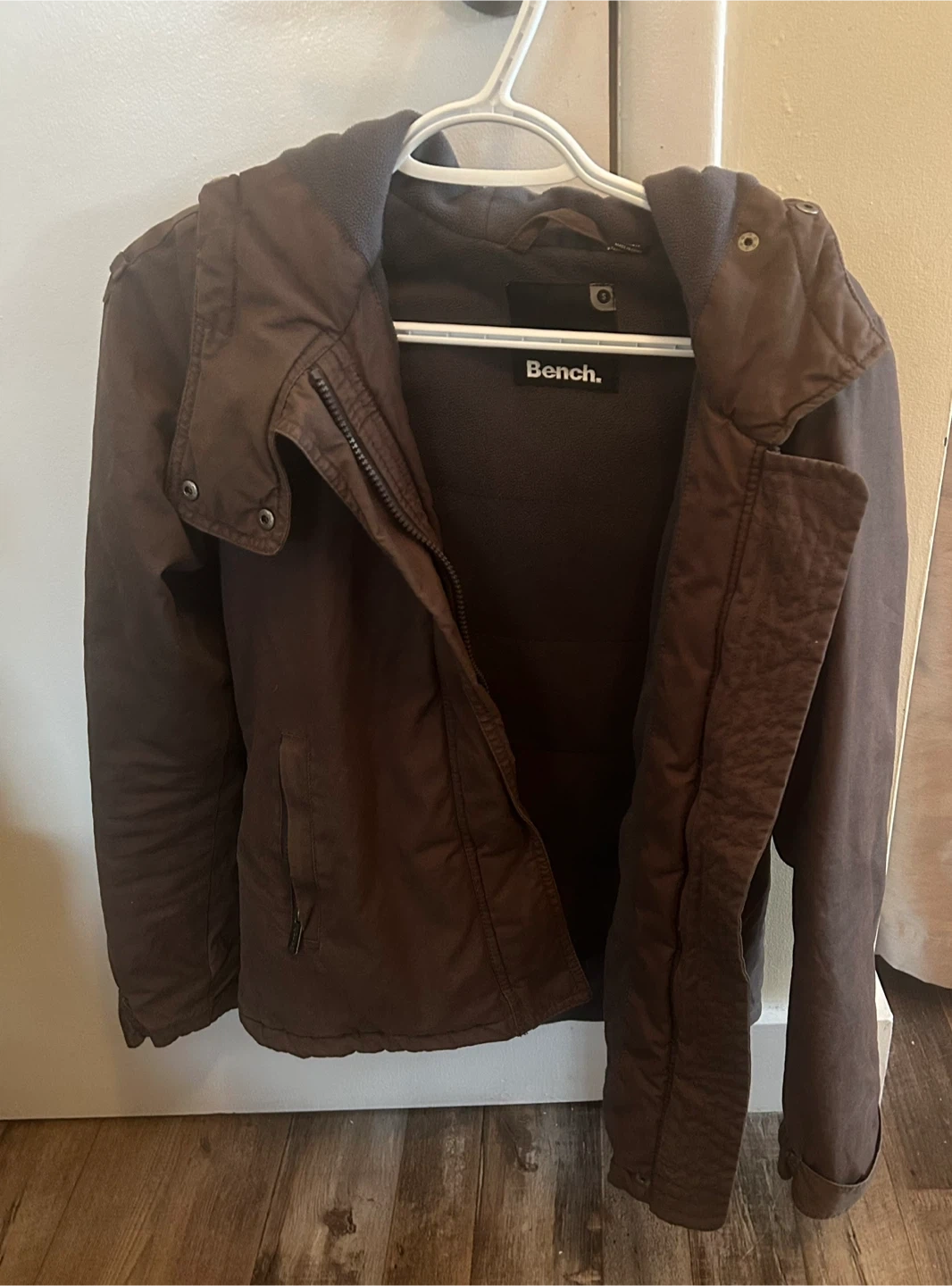 Bench. brown hooded jacket with a fleece lining. It's a size small. Offers warmth and a stylish look for cooler weather.