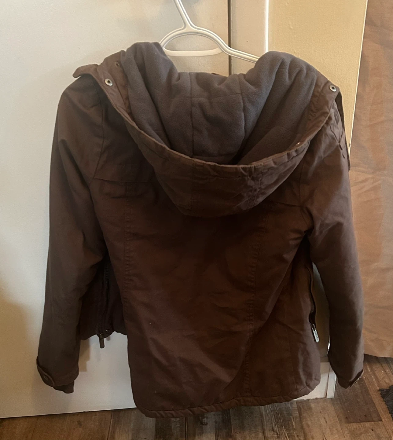 Bench. brown hooded jacket with a fleece lining. It's a size small. Offers warmth and a stylish look for cooler weather.