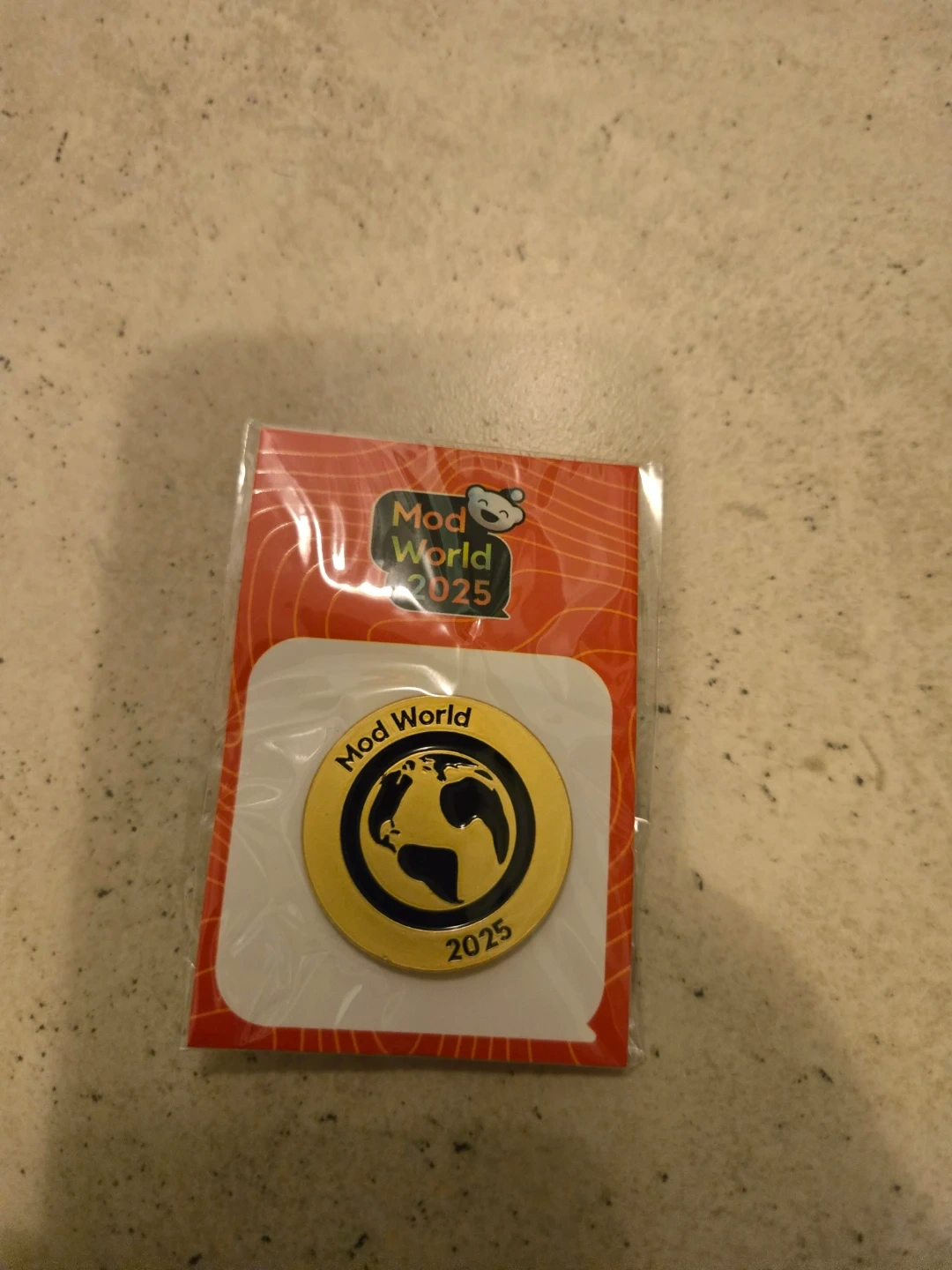 This is a Mod World 2025 coin. It's gold-coloured with a black and gold globe design. This coin is great for collectors or as a commemorative item.