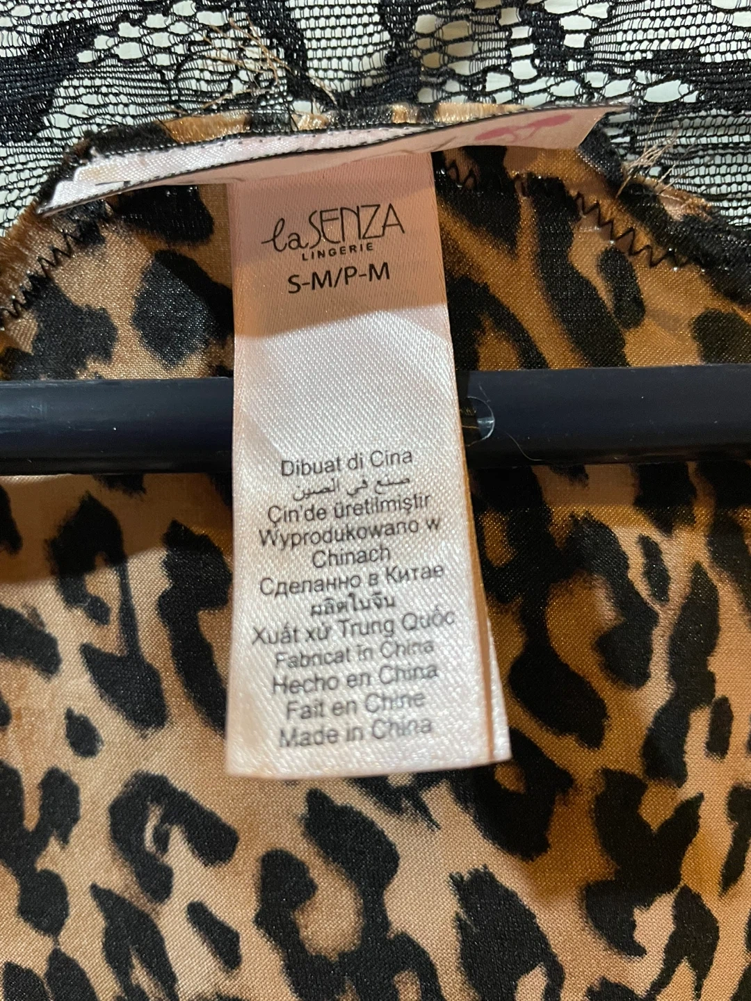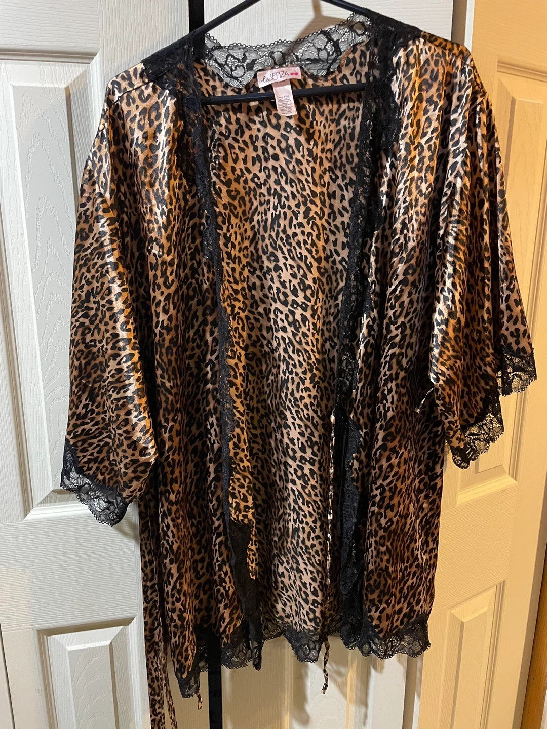 This La Senza lingerie robe features a classic leopard print with delicate black lace trim. It's made from a satin-like material and includes a tie belt for a secure fit. Size is S-M/P-M.
