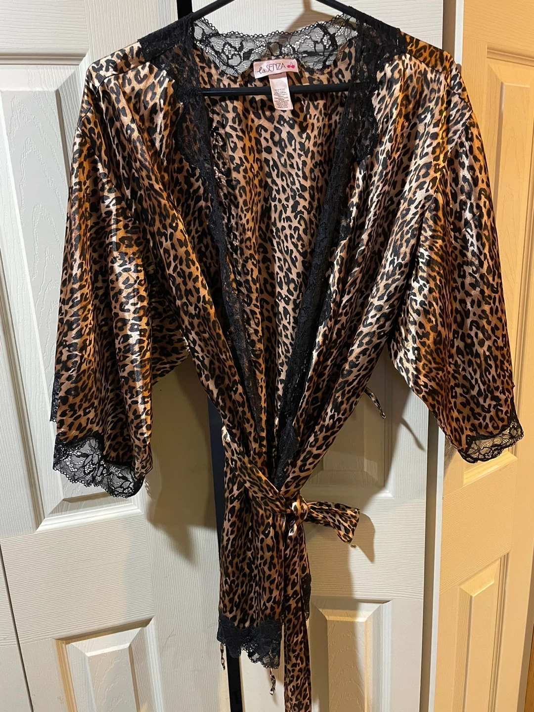 This La Senza lingerie robe features a classic leopard print with delicate black lace trim. It's made from a satin-like material and includes a tie belt for a secure fit. Size is S-M/P-M.