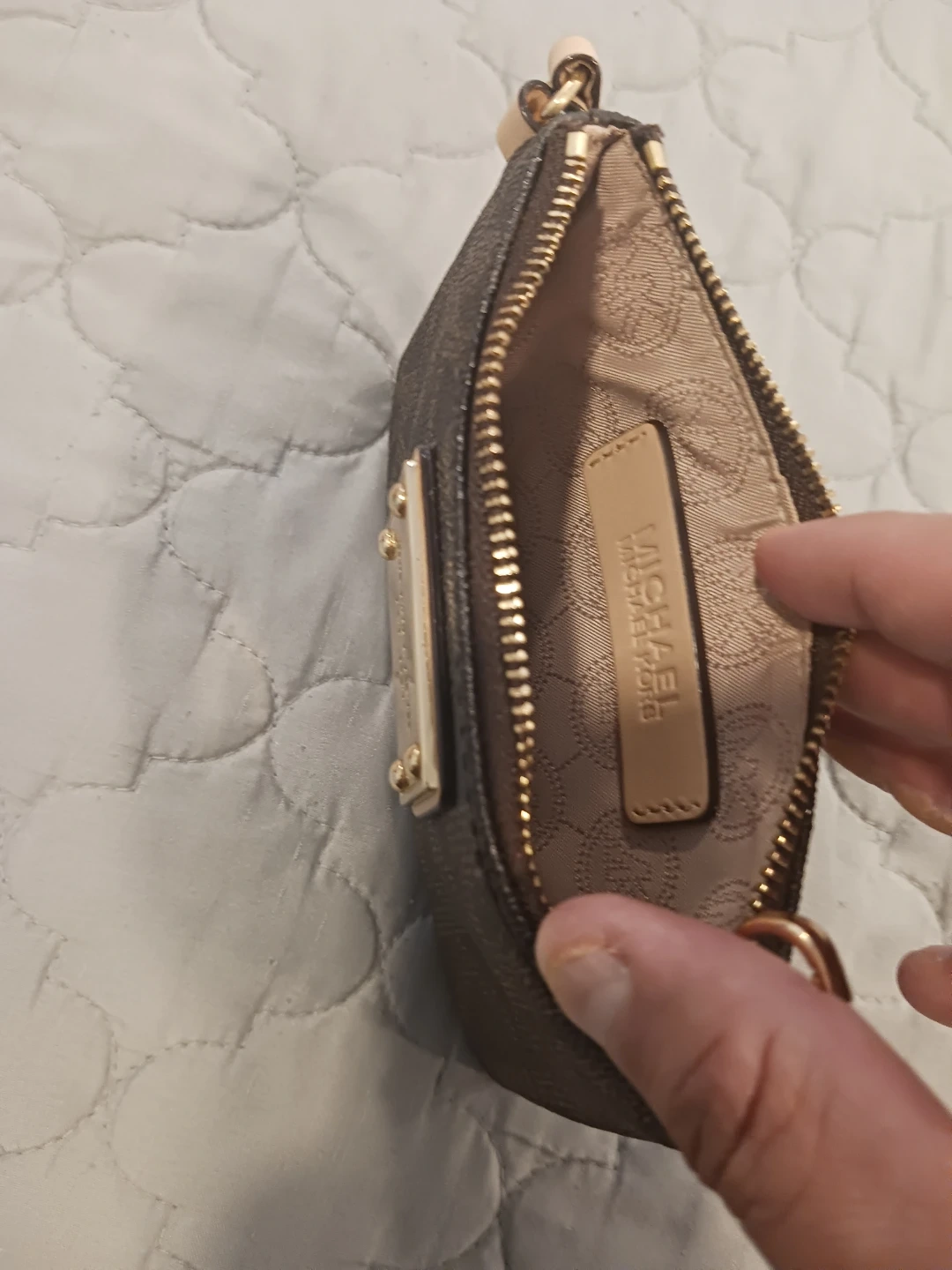 This Michael Kors wristlet pouch features the signature MK logo pattern in brown. It's made of coated canvas with leather trim and a gold-tone hardware detail. Includes a detachable wrist strap for easy carrying.