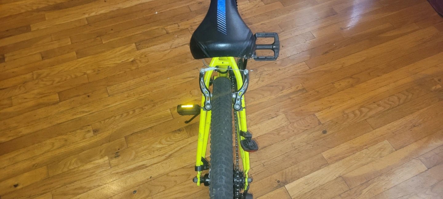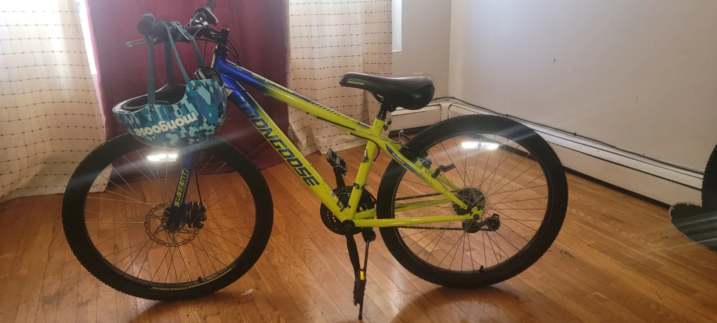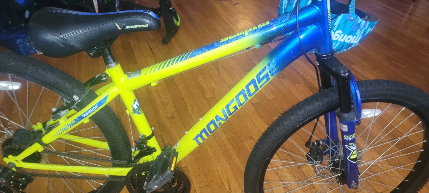 This is a Mongoose kids' bicycle in a yellow and blue color scheme. It features a front suspension fork and disc brakes for reliable stopping power. A helmet is included! Great for young riders hitting the trails or neighborhood streets. Needs Fixes: Brakes, Oil Clean, and Clean.