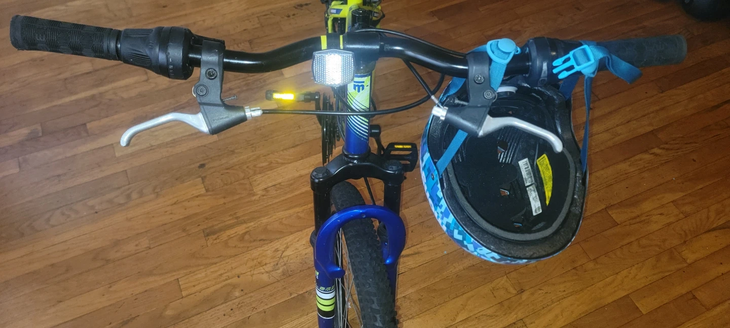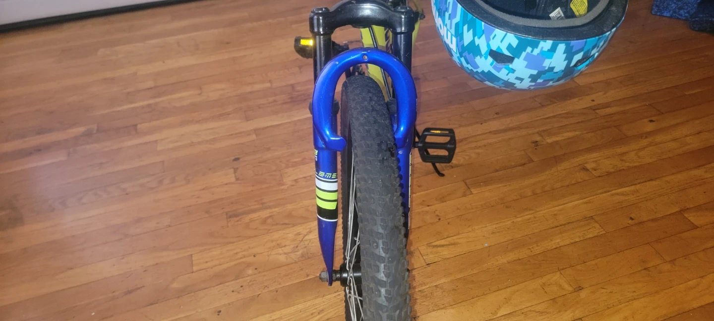 This is a Mongoose kids' bicycle in a yellow and blue color scheme. It features a front suspension fork and disc brakes for reliable stopping power. A helmet is included! Great for young riders hitting the trails or neighborhood streets. Needs Fixes: Brakes, Oil Clean, and Clean.
