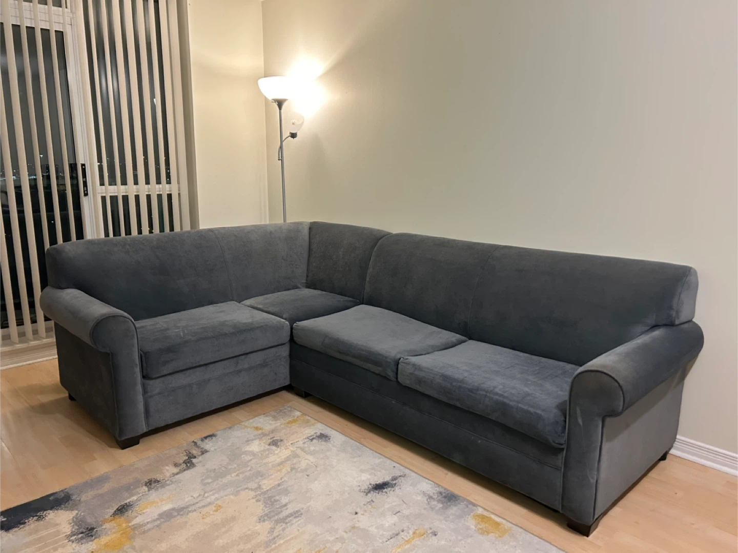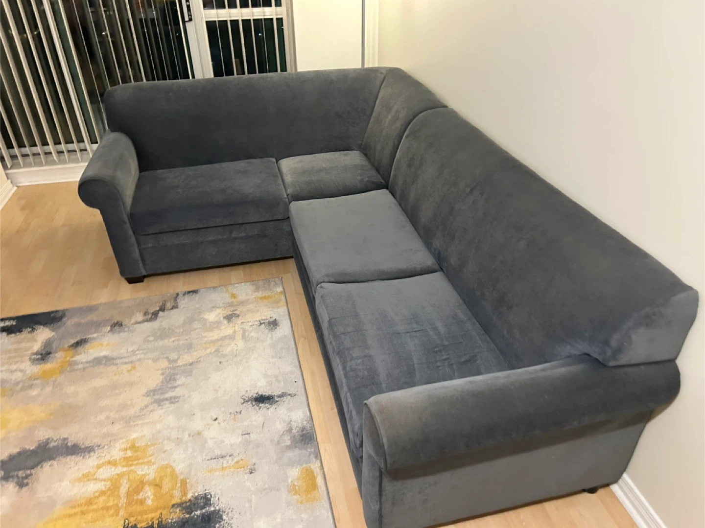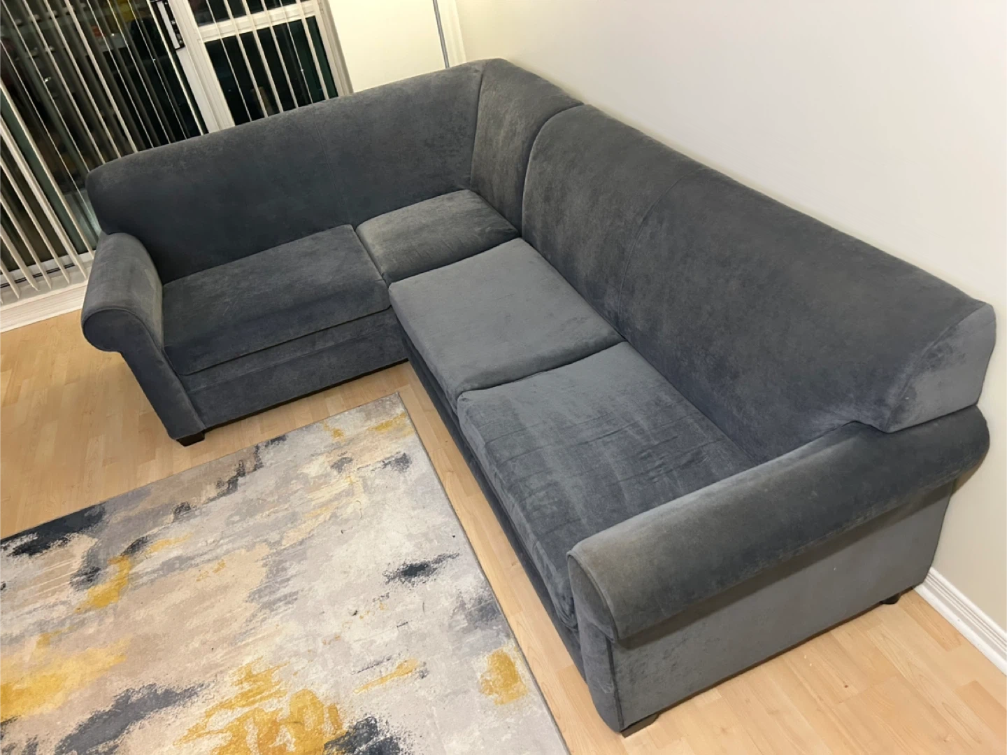 Selling a dark blue sectional sofa bed, no stains or rips. Sofa bed and chaise are in good condition. Getting a new sofa and there’s no space for this one anymore.