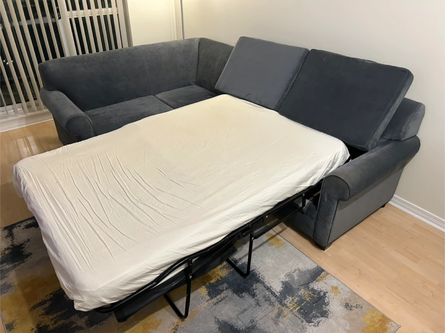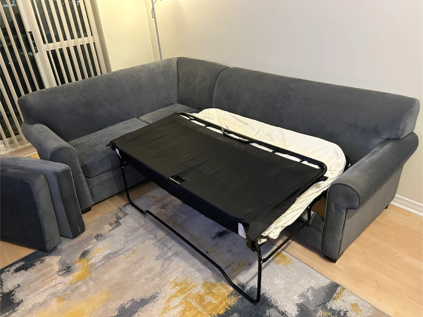 Selling a dark blue sectional sofa bed, no stains or rips. Sofa bed and chaise are in good condition. Getting a new sofa and there’s no space for this one anymore.