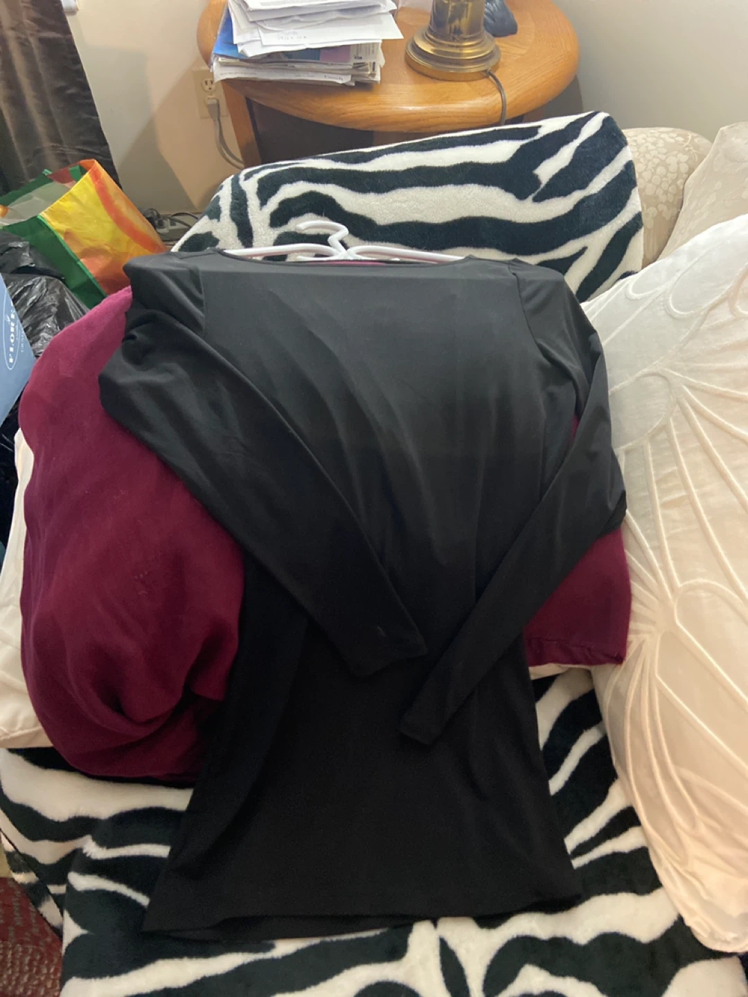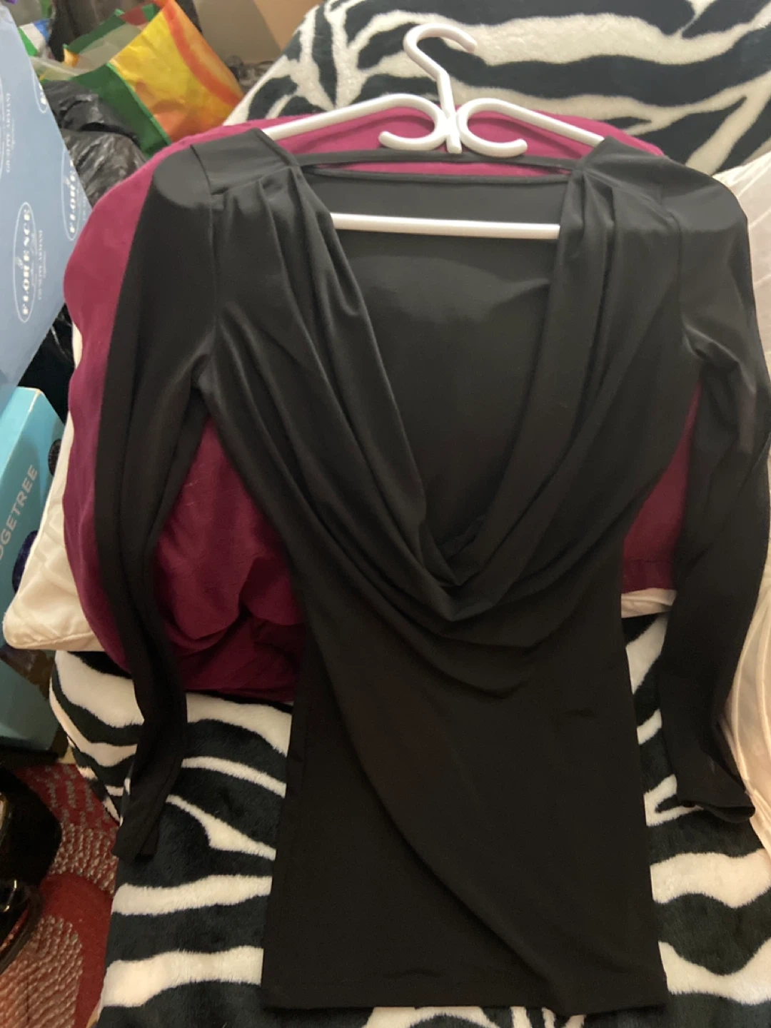 Black long-sleeve dress with a draped neckline. It's made of a soft, stretchy material. This dress is a great option for an evening out! GuessStore