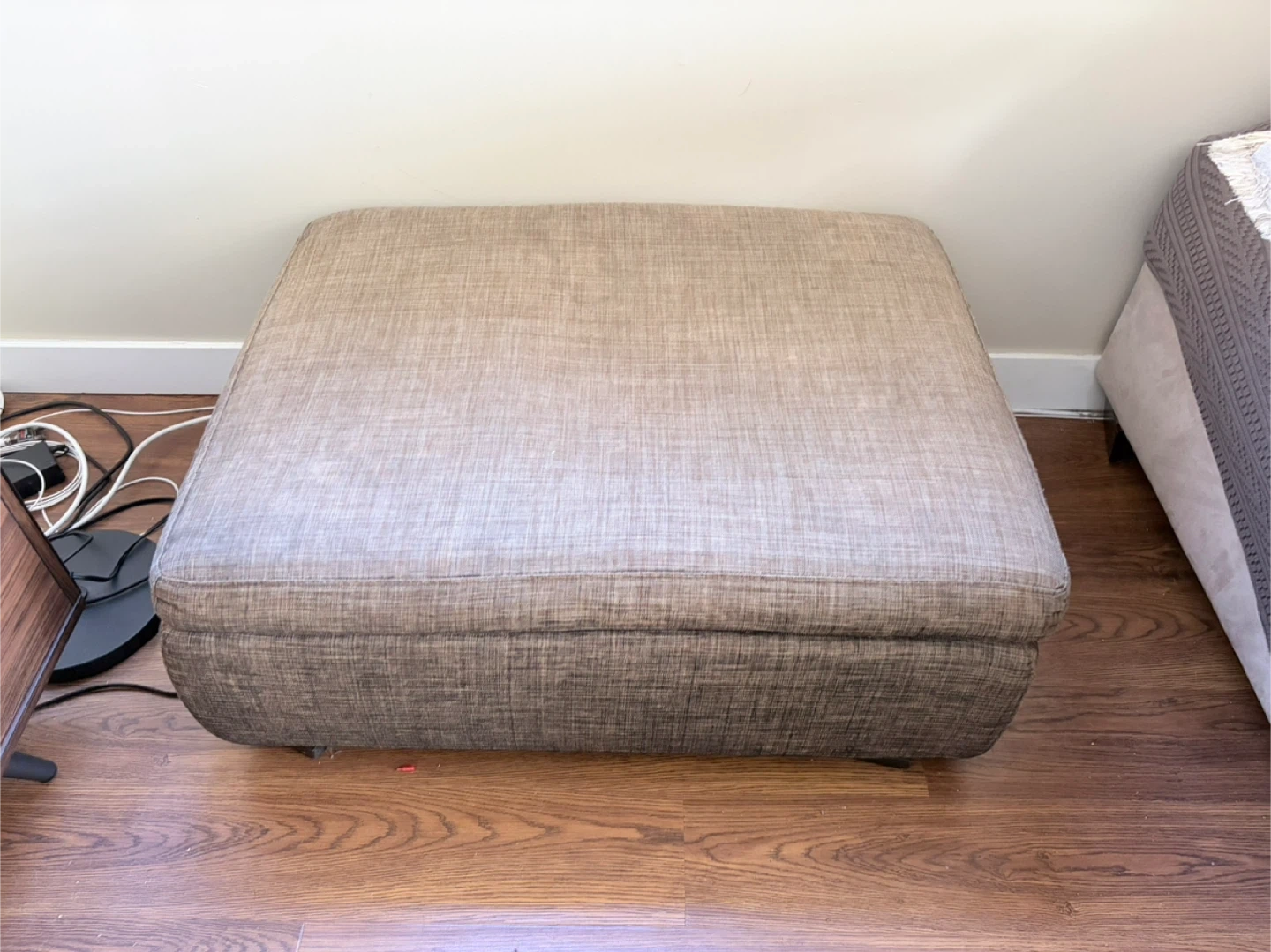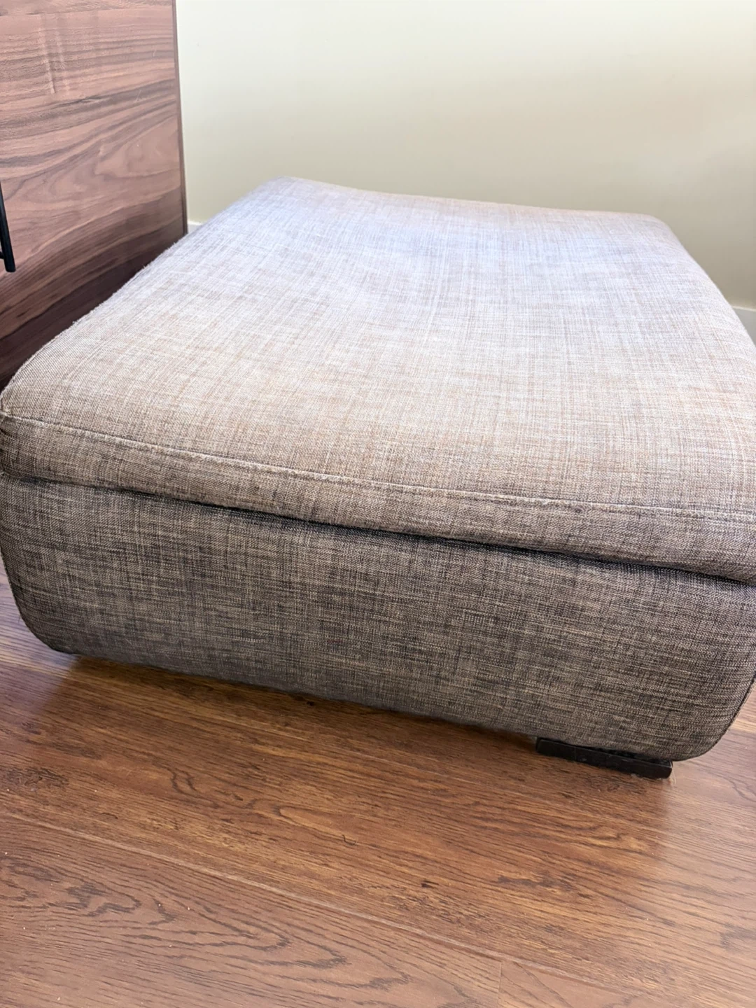 This is a square upholstered ottoman with a textured fabric. It's a neutral taupe colour that'll match most decor. The ottoman is a good size for putting your feet up or as an extra seat.