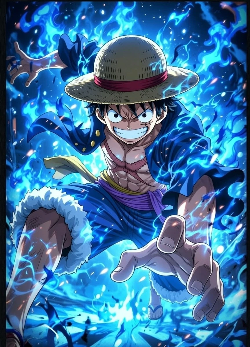 Cool art print featuring Monkey D. Luffy from One Piece. The image shows Luffy surrounded by blue flames, ready for action. It's perfect for any anime fan's collection. Great for a bedroom or entertainment space!