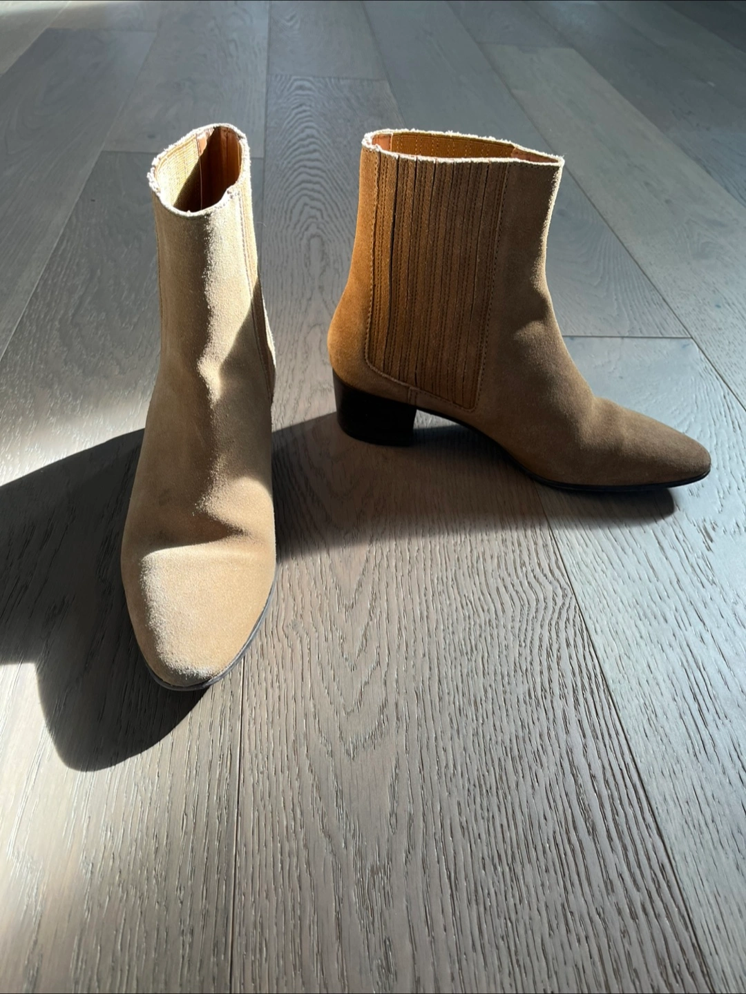 Tan suede ankle boots. Low block heel. Pointed toe. Elastic side panels. Pre-owned. Love these shoes a lot but can’t wear them anymore due to foot injury!
