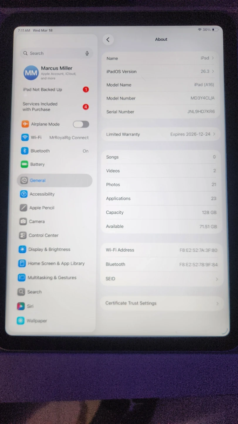 Apple iPad (11th Gen) with 128GB storage and Wi-Fi connectivity. It's in silver and comes with its original box. This iPad runs iPadOS 26 and has a 10.2-inch Retina display. It's perfect for everyday tasks, streaming, and light productivity.