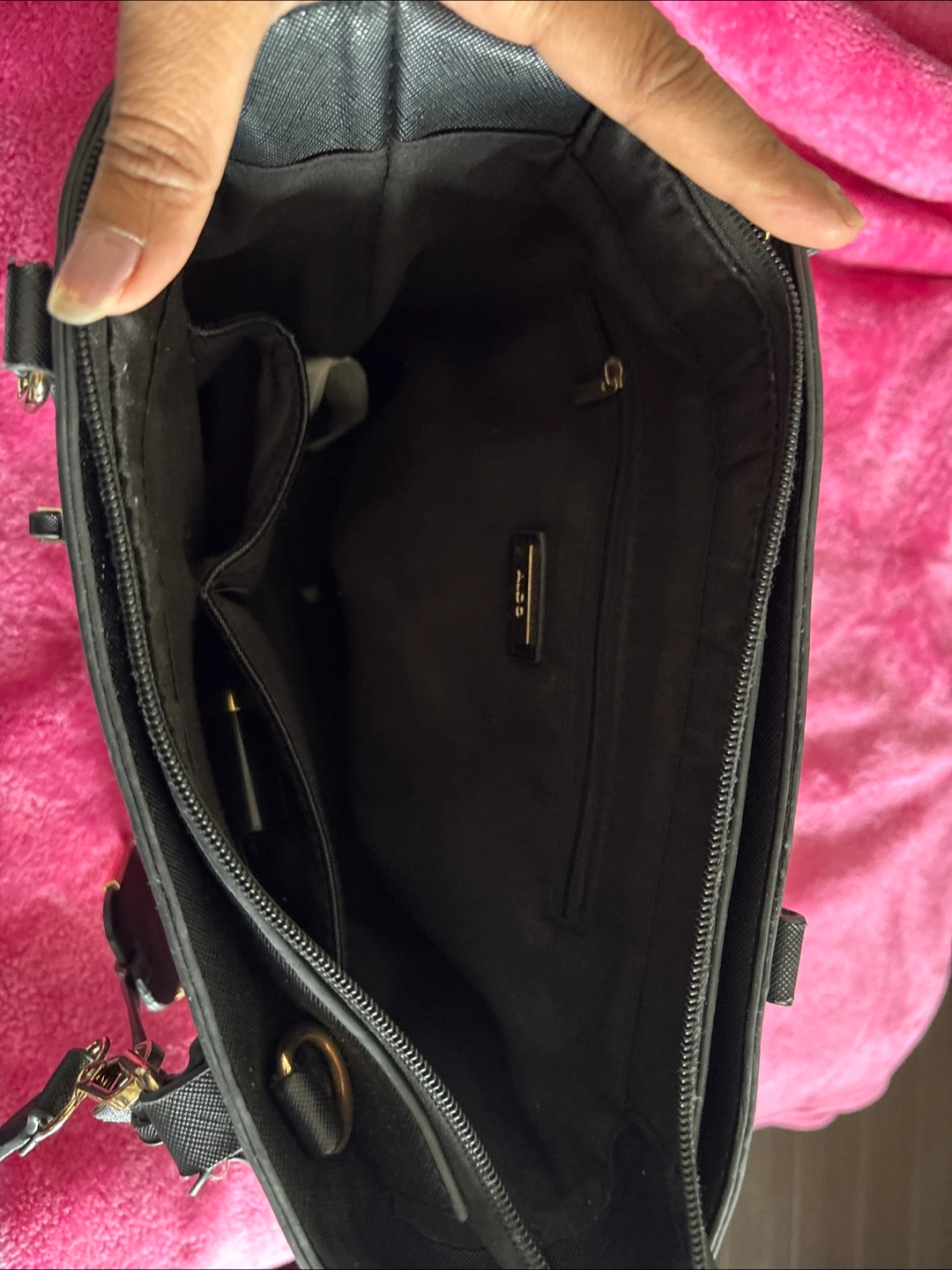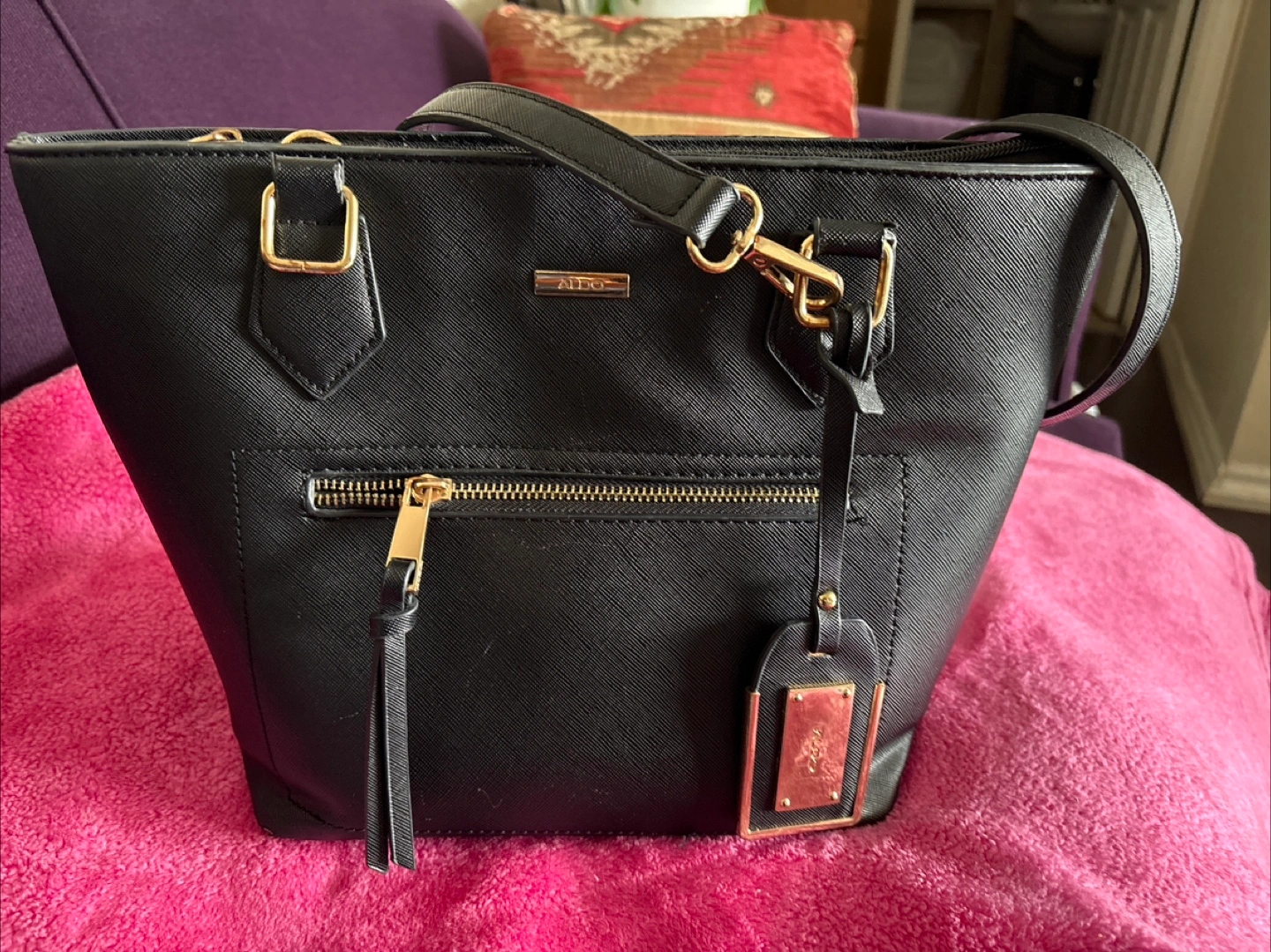 Black ALDO handbag. Features gold-tone hardware. Top zip closure. Interior pockets. Detachable shoulder strap. Excellent for everyday use.