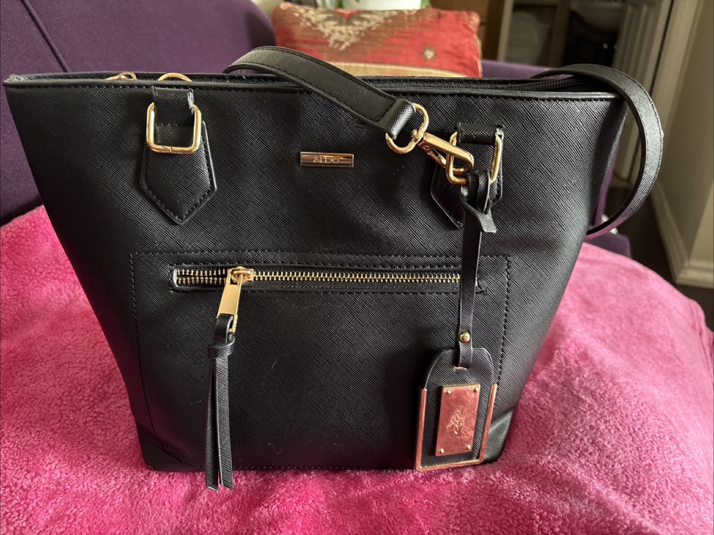 Black ALDO handbag. Features gold-tone hardware. Top zip closure. Interior pockets. Detachable shoulder strap. Excellent for everyday use.