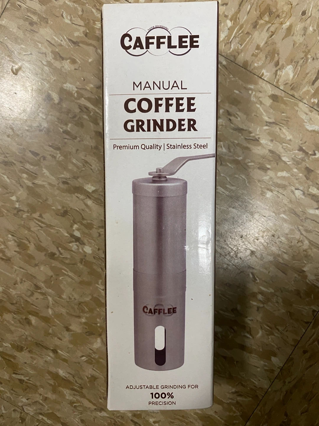 This is a manual coffee grinder from Cafflee. It's made of stainless steel with premium quality. It offers adjustable grinding for 100% precision.