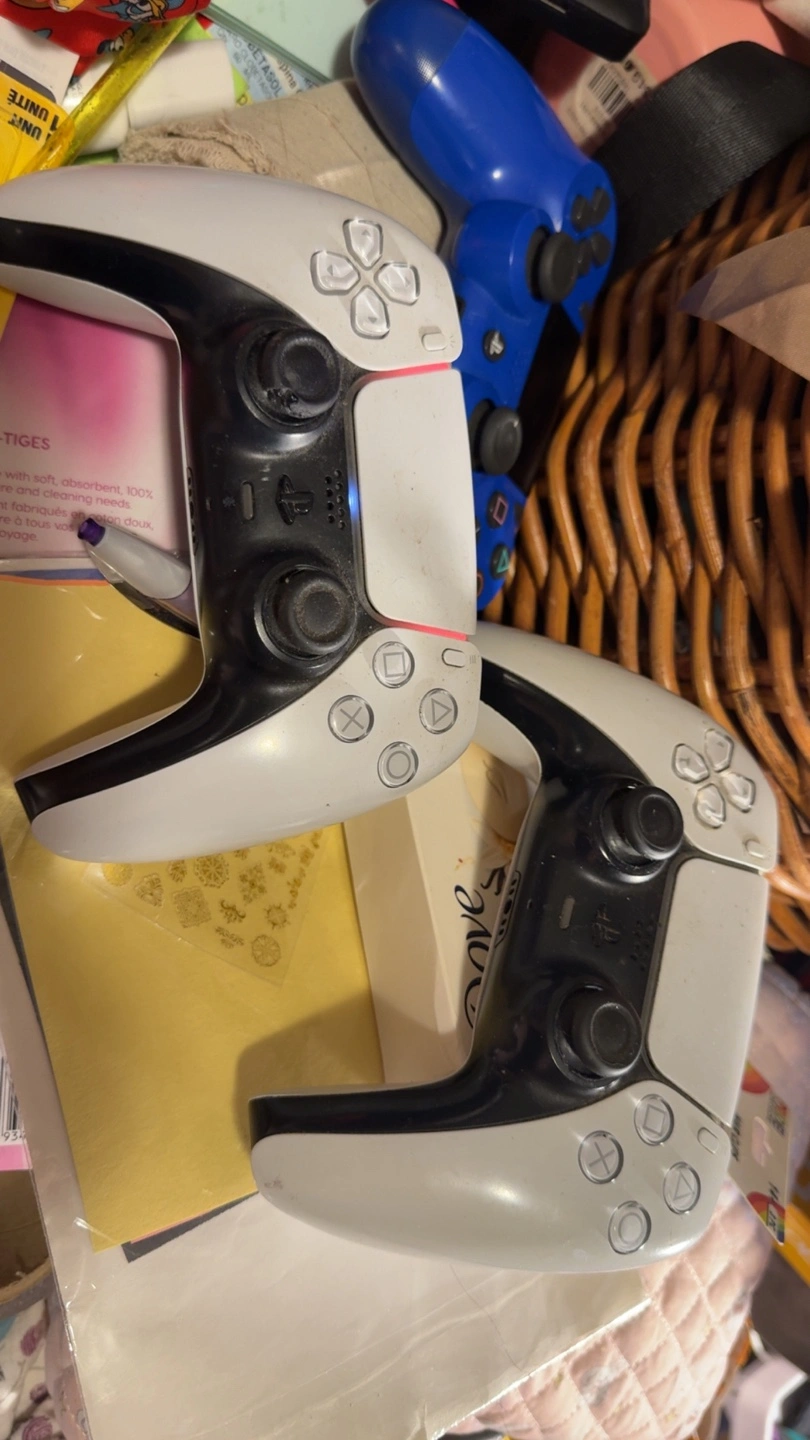 Pair of used PS5 controllers. White and black colour scheme. Some minor wear.