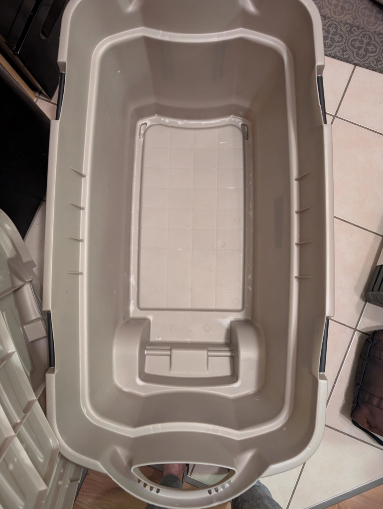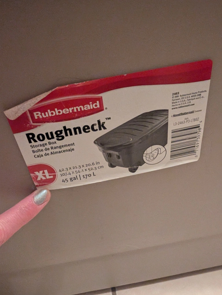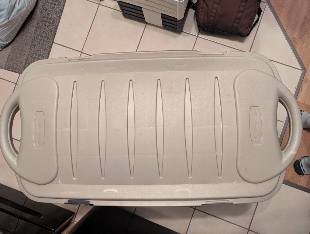 Large storage box with latching lid and handles on all sides and two wheels for easy moving.
