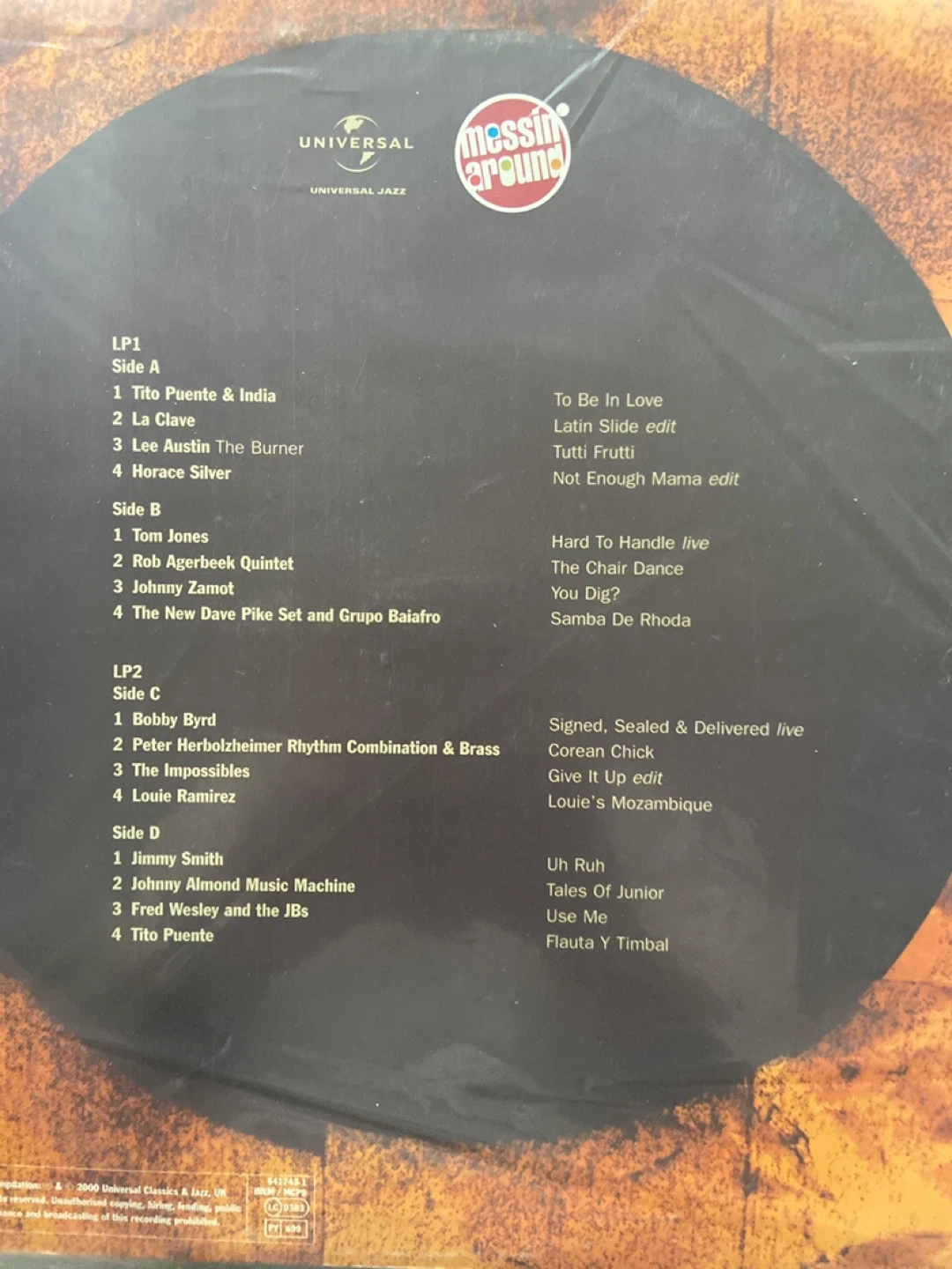 Universal Jazz presents 'Messin' Around', a compilation featuring Dancefloor Jazz, Deep Latin & Hard Funk. This vinyl record includes LPs with tracks from Tito Puente, Tom Jones, Bobby Byrd, and Jimmy Smith. Side A includes 'To Be In Love' and 'Latin Slide edit', while Side B features 'Hard to Handle live' and 'The Chair Dance'.