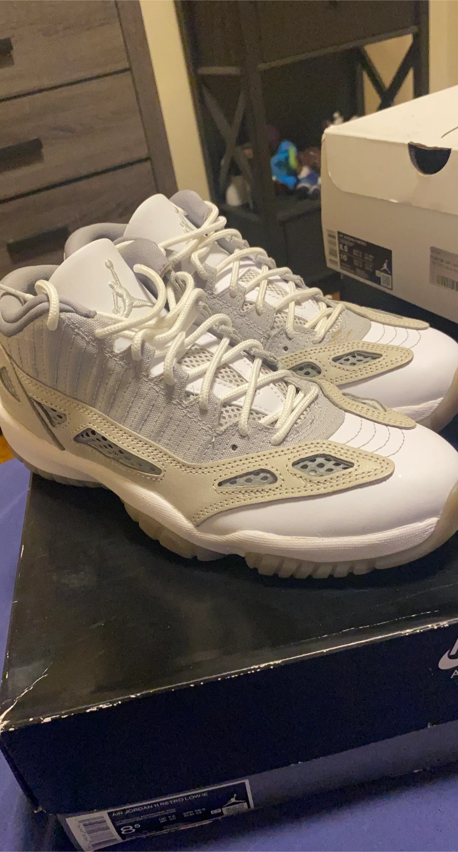 Men's Jordan 11 Retro Low IE sneakers in a Light Orewood Brown and white colorway. Features a textile and leather upper. Includes original box. US Men's size 8.5.