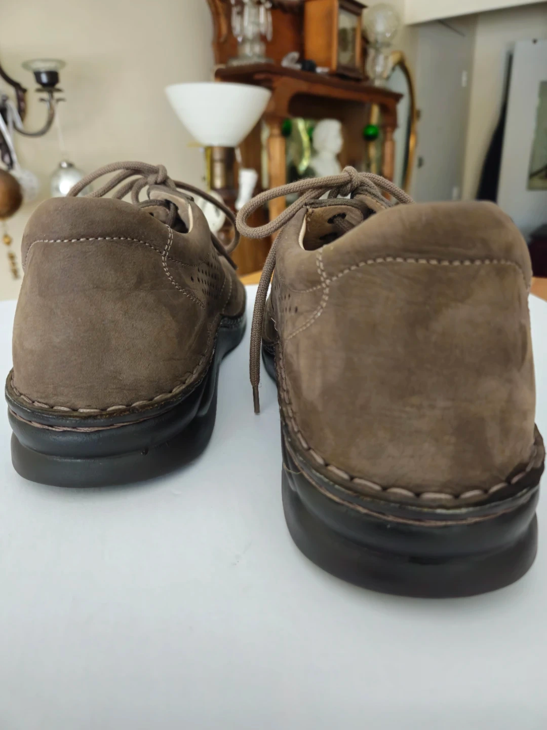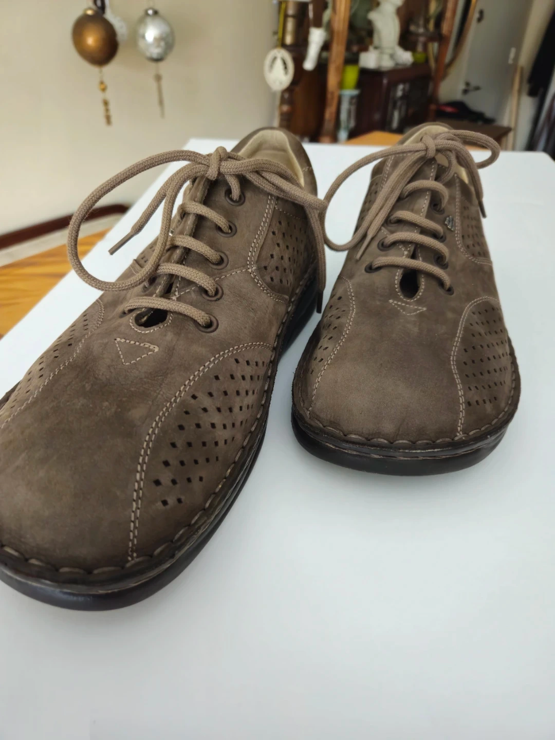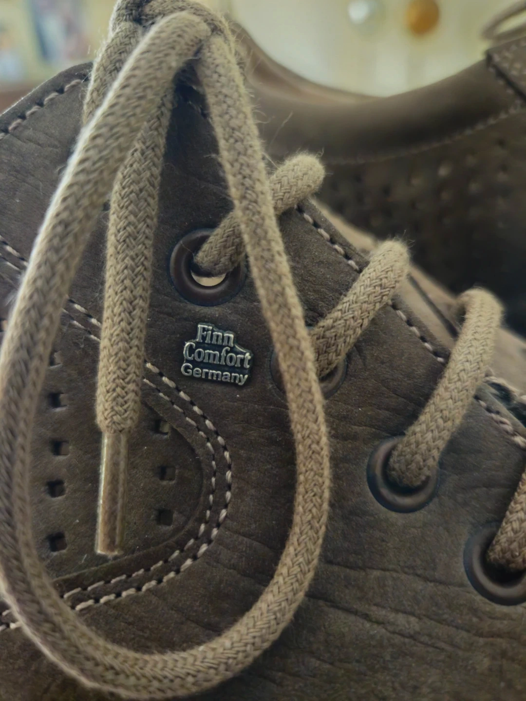 Finn Comfort shoes made in Germany. These brown suede shoes feature perforations for breathability and a lace-up closure. They have a 'Shock Absorb' sole.